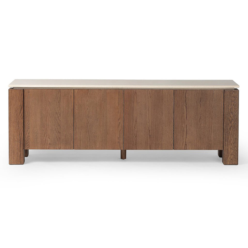 A structurally simple console mixes tan-finished oak casing with a creamy white marble top, for a gorgeous material pairing. Inside, generous space awaits all your media storage needs.