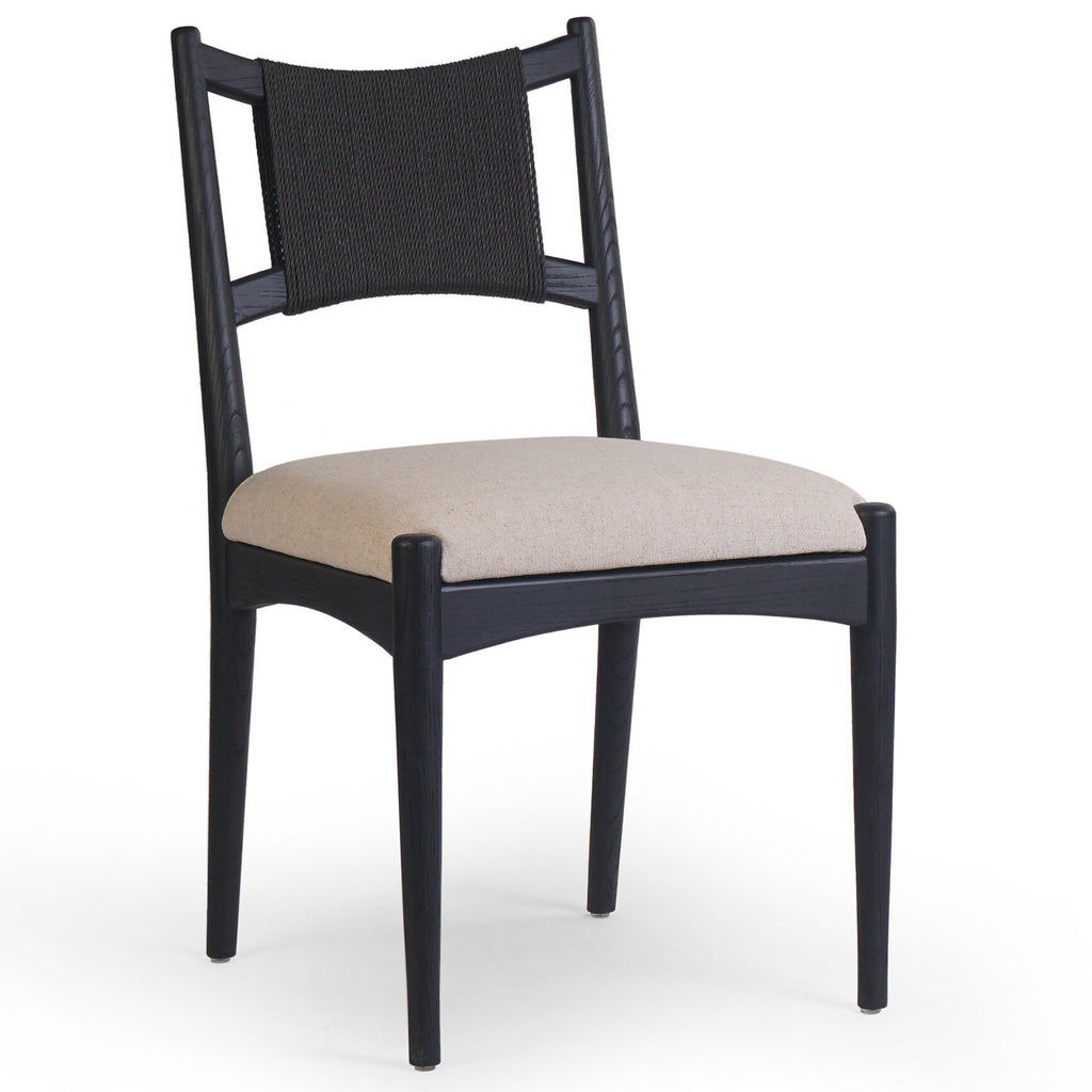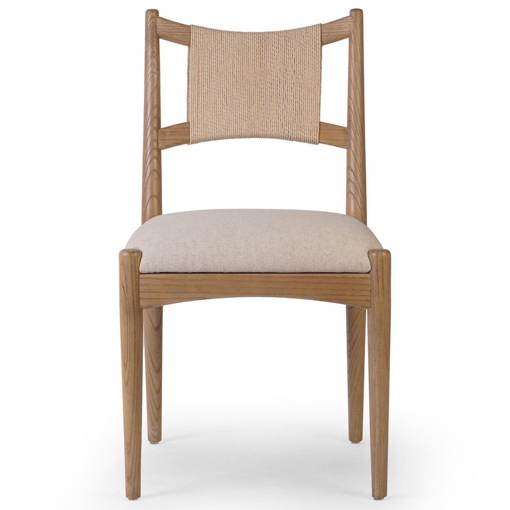 A curved back wrapped and textural woven paper cord take this everyday dining chair to new heights. Parawood frames a linen-blend seat for a clean, monochromatic look.