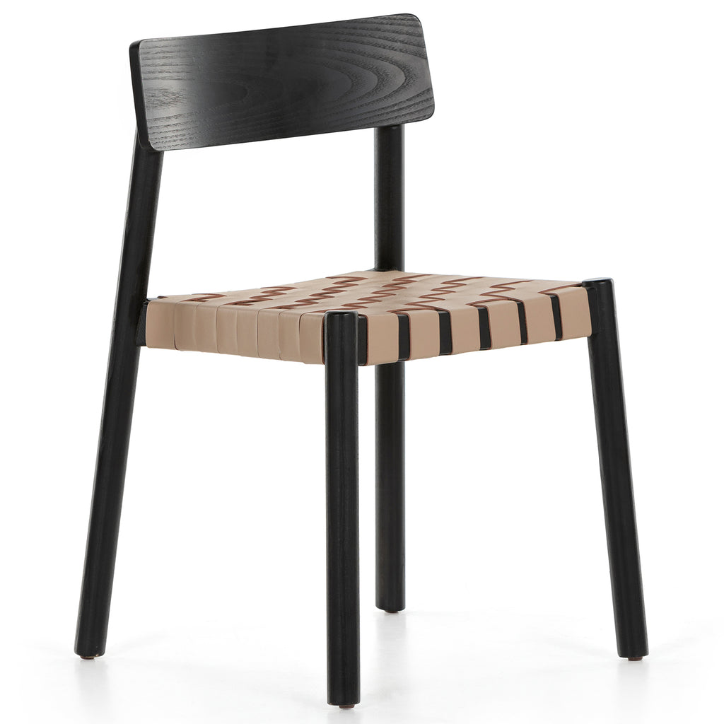 Finished in a jet black, solid ash forms an airy, angular frame for woven leather seating in a cleverly contrasting tan.