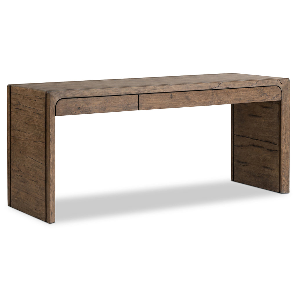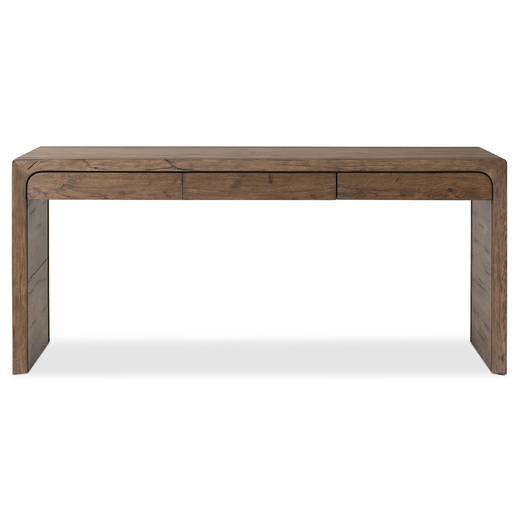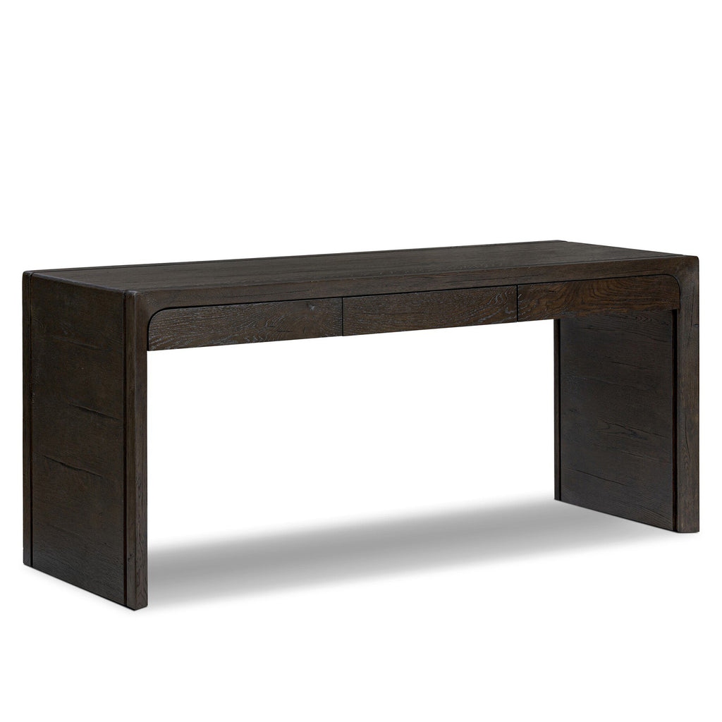 Made from solid reclaimed oak finished in a rustic gray, this slim-profile desk shapes subtly curved corners, bringing a handcrafted look to a minimalist form. Designed in partnership with longtime Four Hands collaborator Thomas Bina and Brazilian designer Ronald Sasson.