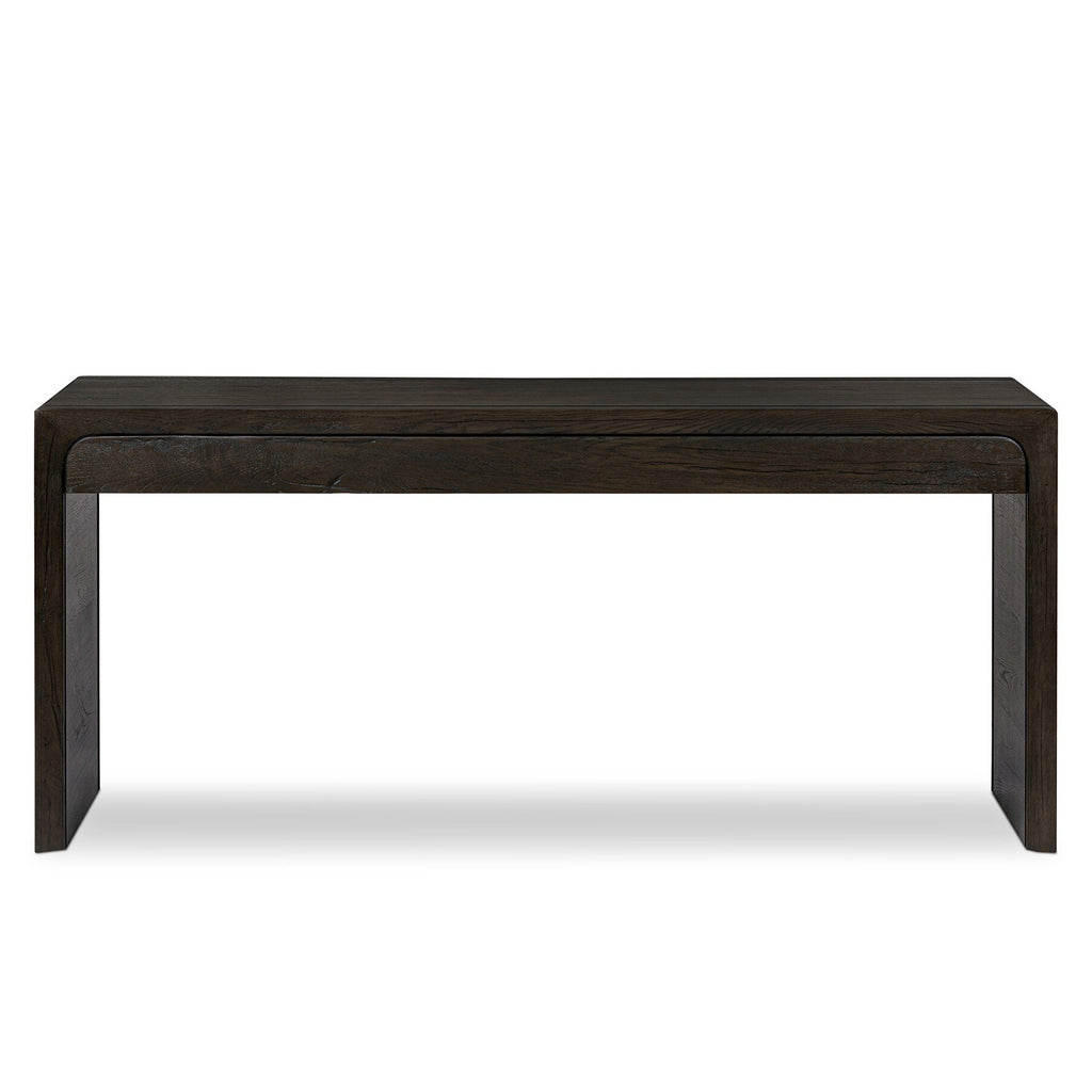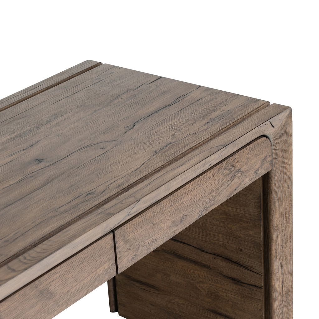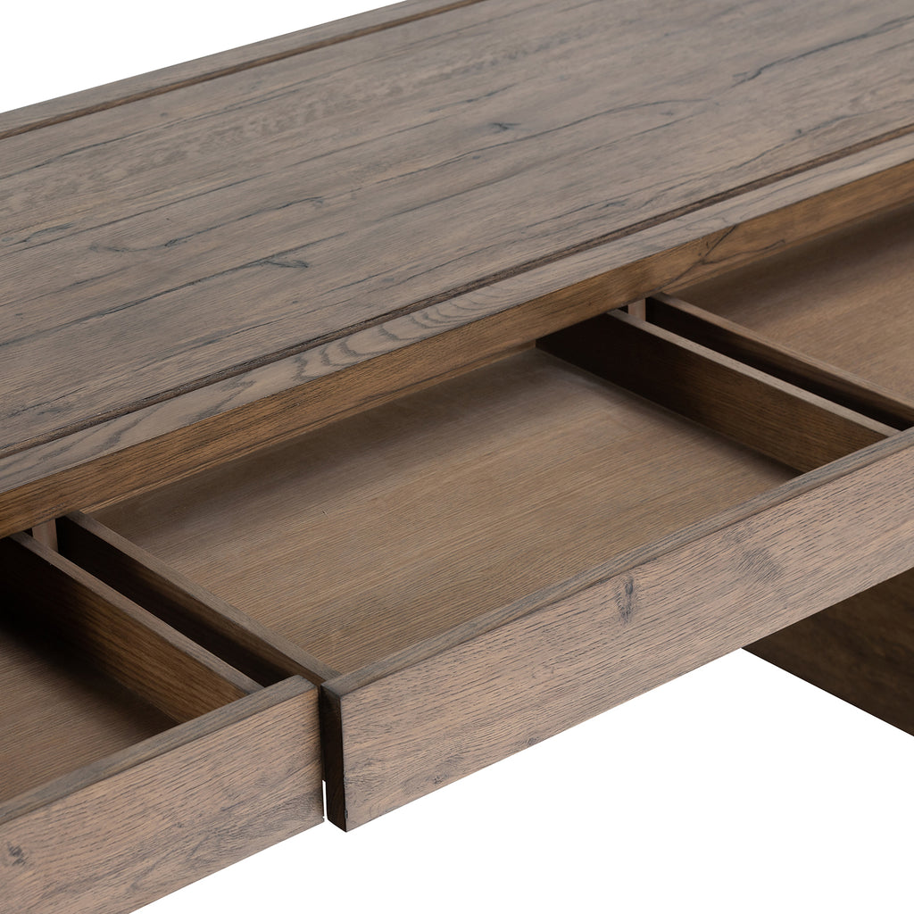 Made from solid reclaimed oak finished in a rustic gray, this slim-profile desk shapes subtly curved corners, bringing a handcrafted look to a minimalist form. Designed in partnership with longtime Four Hands collaborator Thomas Bina and Brazilian designer Ronald Sasson.