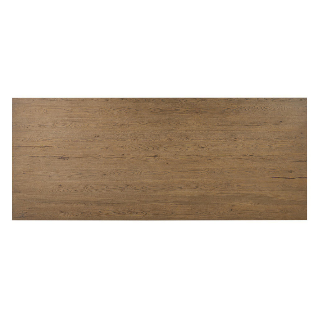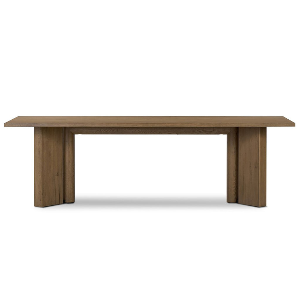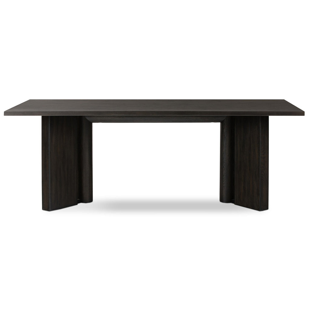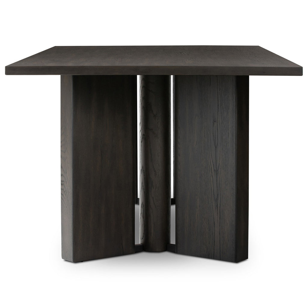 A smoked black finish brings character to this substantially sized dining table. Angled panel legs separated by a round cylinder craft a geometric look.