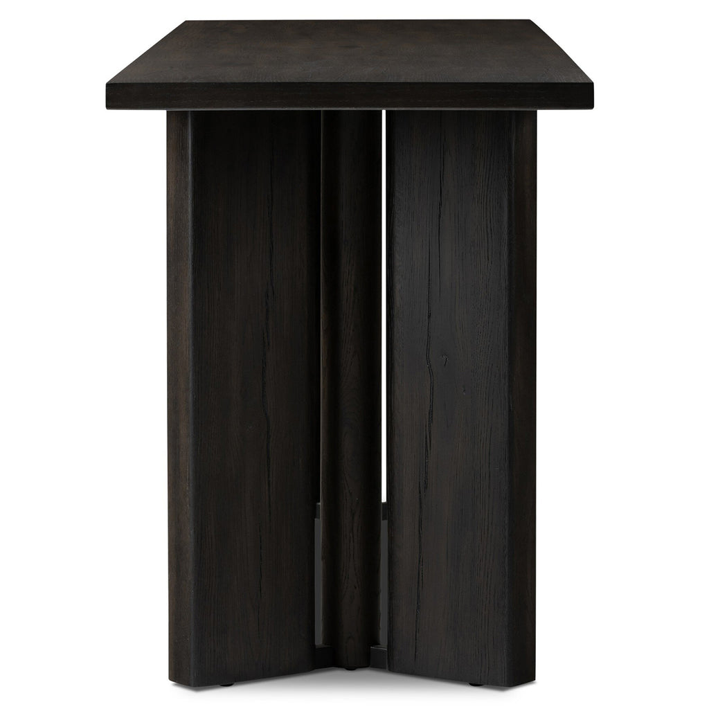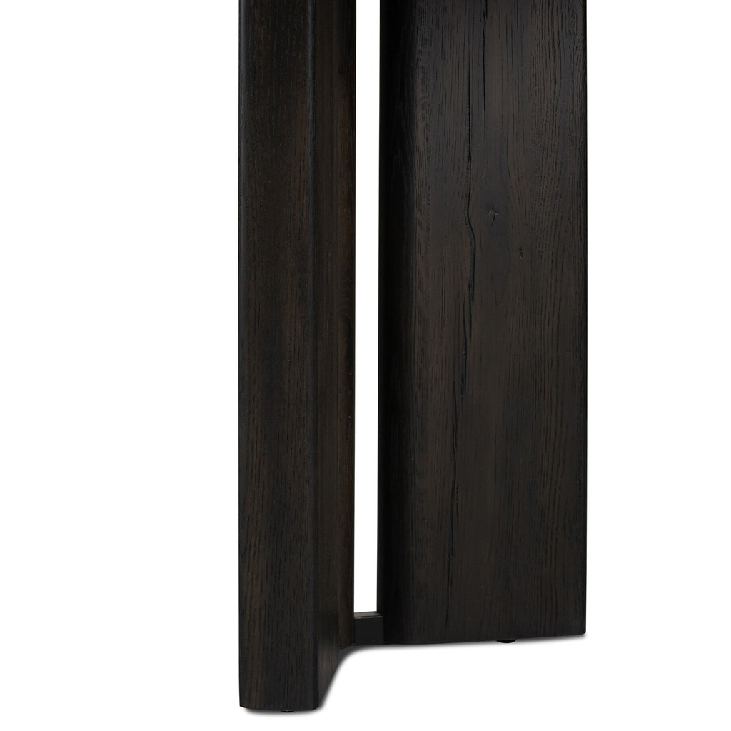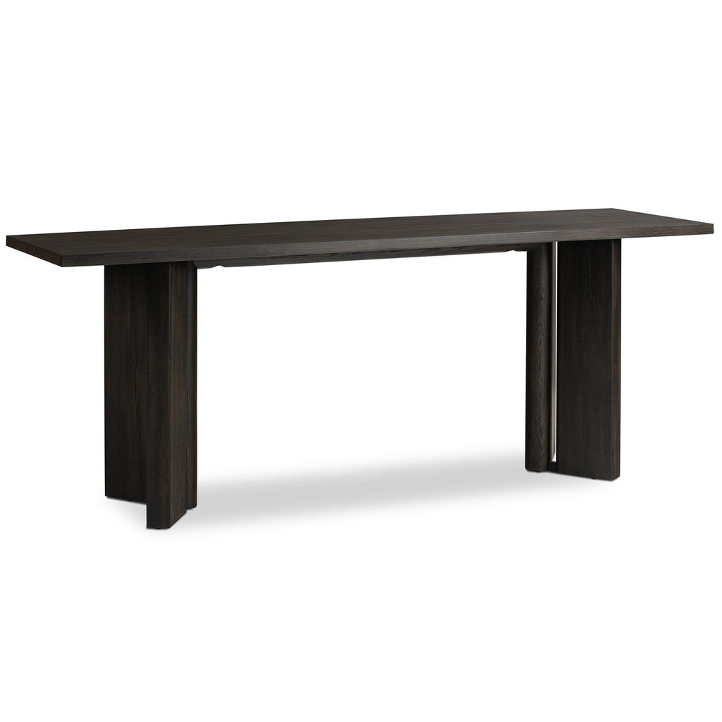 A smoked black or rubbed light oak finish delivers a character-rich look to an open-style console table. Angled panel legs up the intrigue factor.