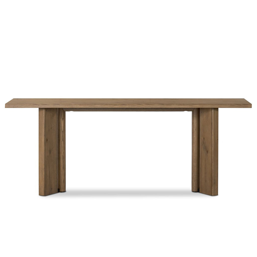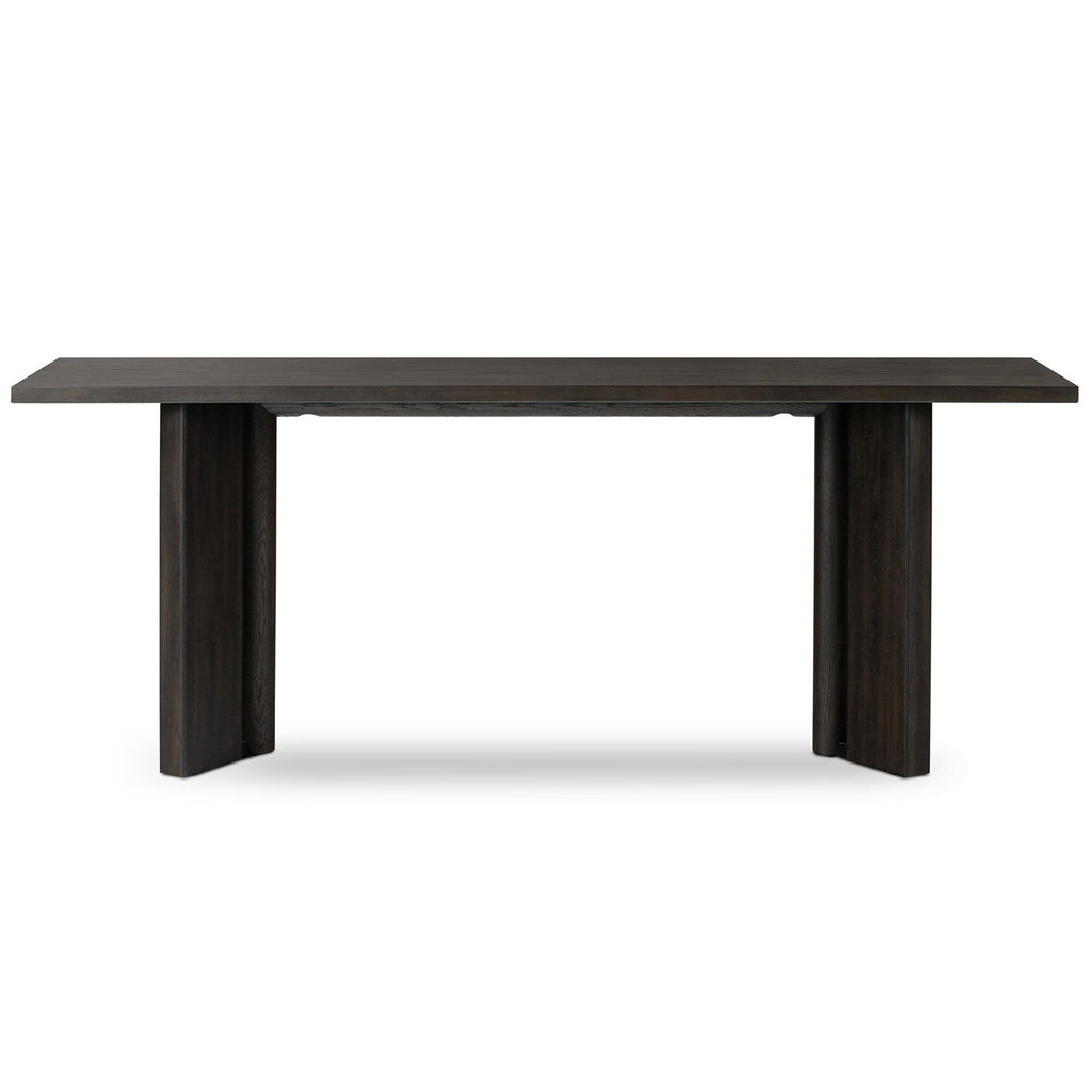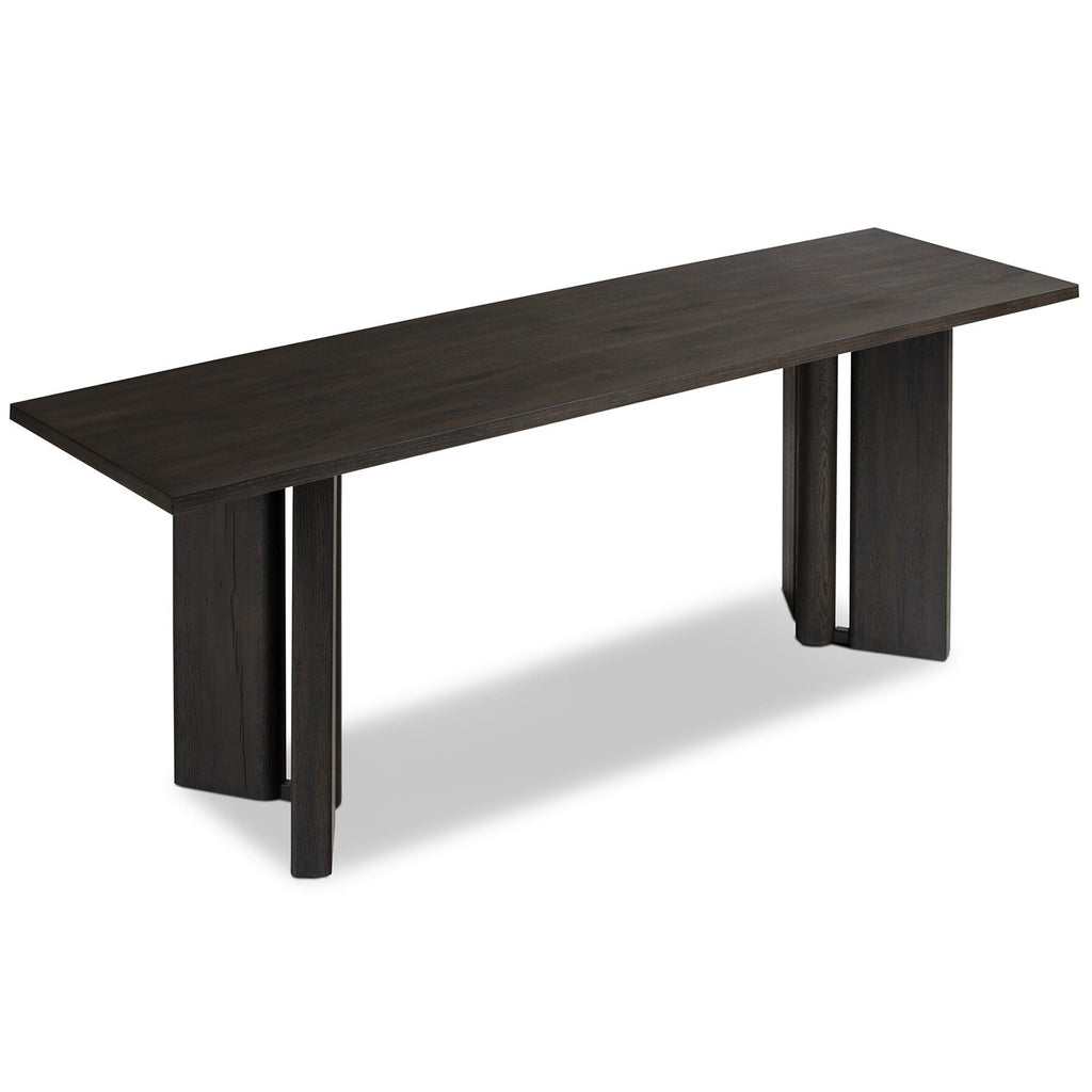A smoked black or rubbed light oak finish delivers a character-rich look to an open-style console table. Angled panel legs up the intrigue factor.
