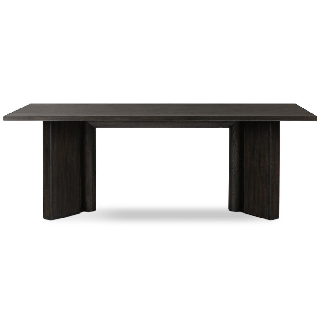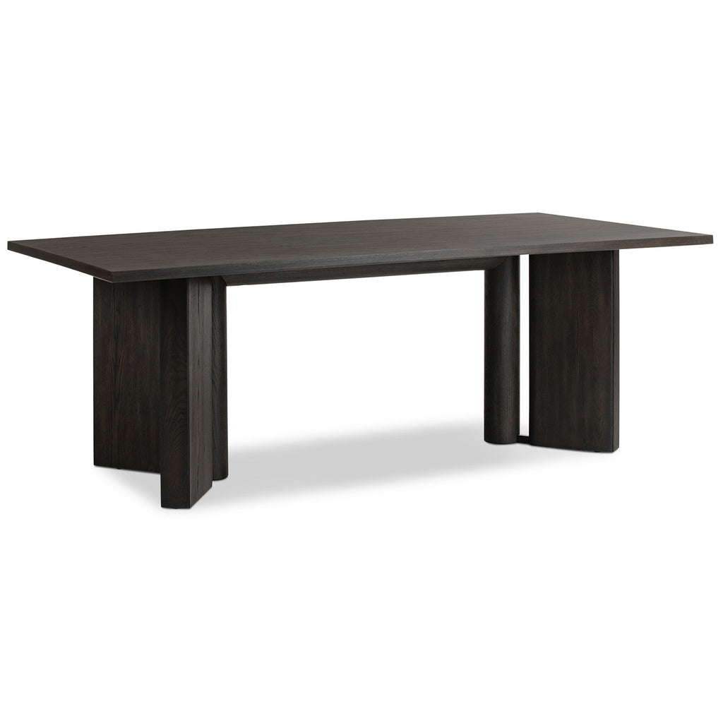 A smoked black finish delivers a character-rich look to an open-style dining table. Angled panel legs separated by a round cylinder up the intrigue factor.