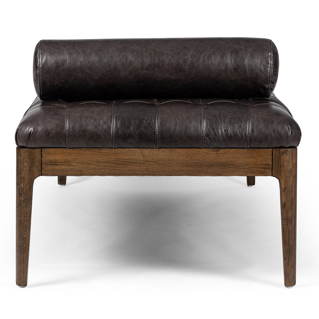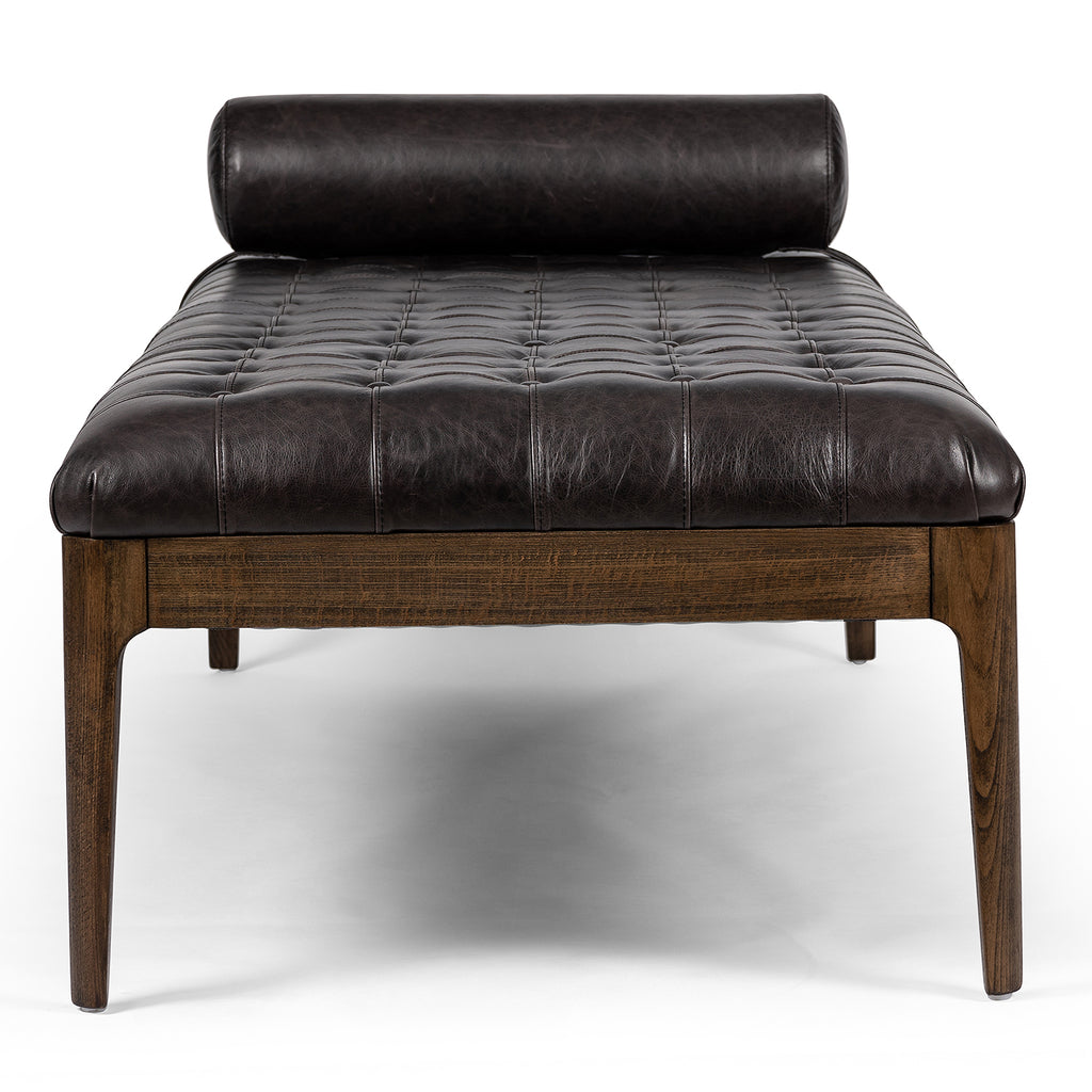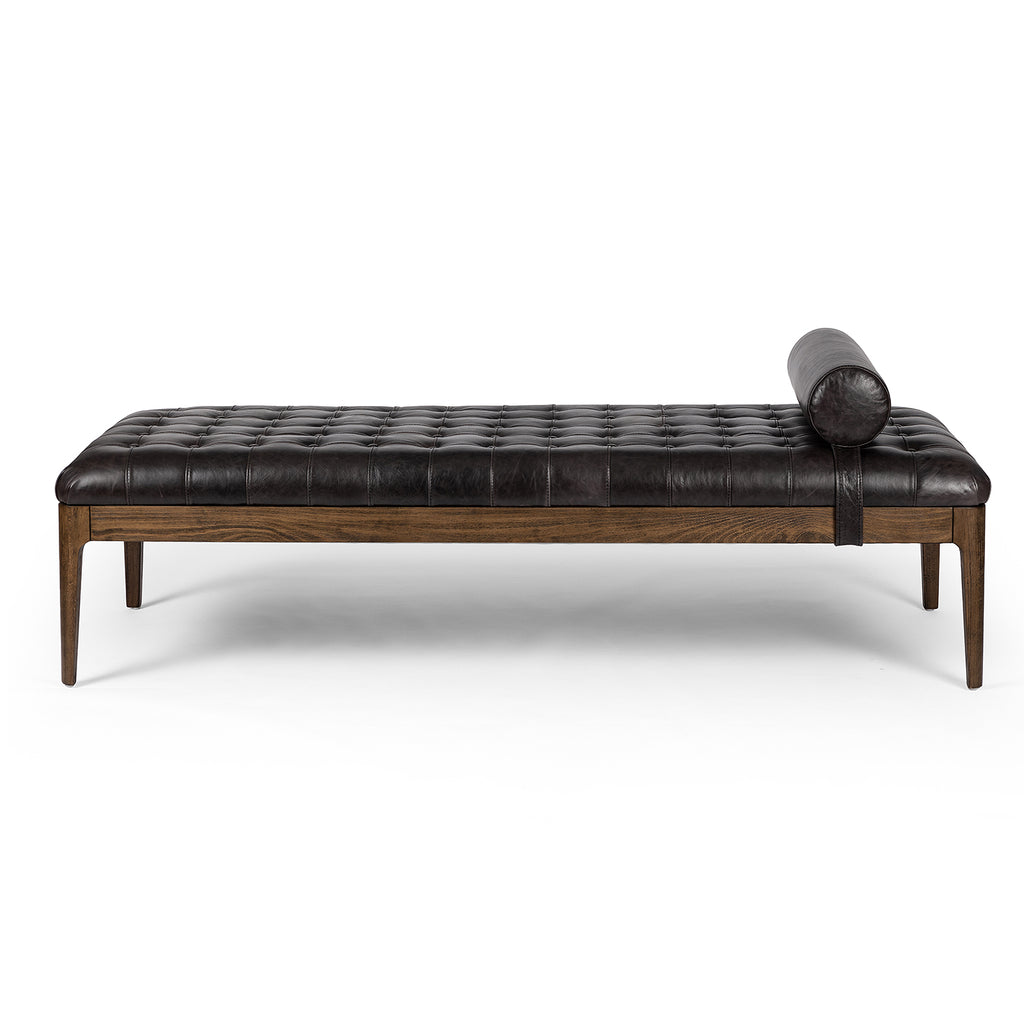 With deep, dramatic tufting and removable bolster pillow, top-grain leather offers a plush place to sit, in an entryway or at the foot of a bed. Moderate seat height at 18.25".