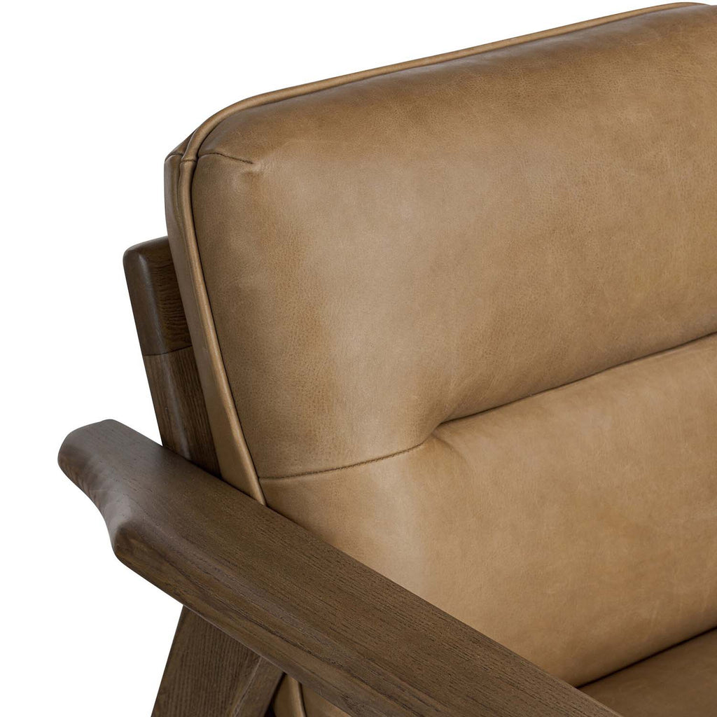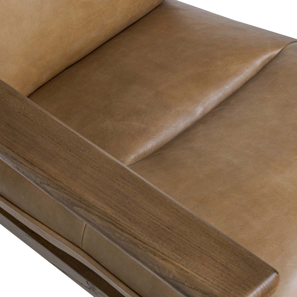 A coastal-inspired lounge chair, modernized. Angled back legs and separate cushioning create a relaxed, inviting look. Mid-level blind stitching refines the seat back. Stark amber ash frame offsets rich top-grain leather, showcasing thick-cut hide with pronounced natural texture.