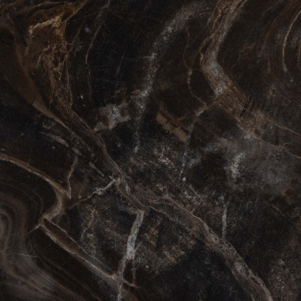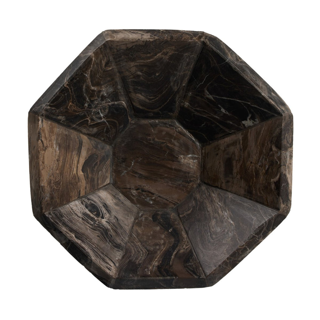 Sheets of brown marble form a faceted bowl that puts the dynamic graining on display. Angular and dimensional, the bowl hovers on four paddle legs for added lightness.