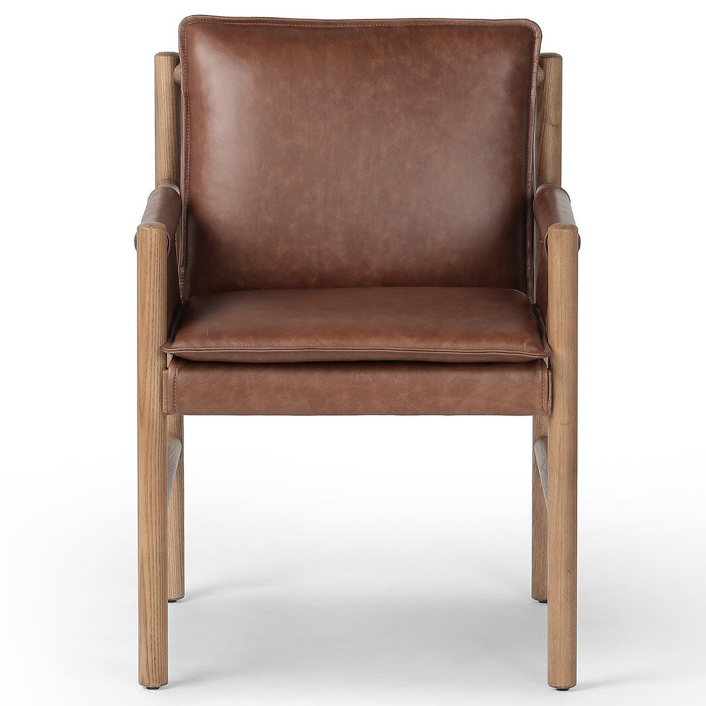 The classic material mix of wood and leather fuse in this sling-style dining chair, with knife-edge cushioning and X-stitch details reminiscent of midcentury decor.