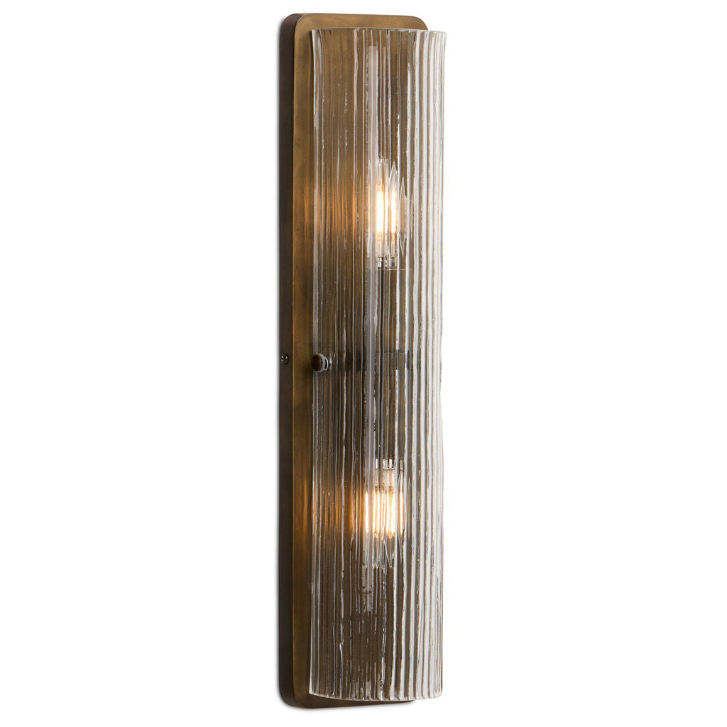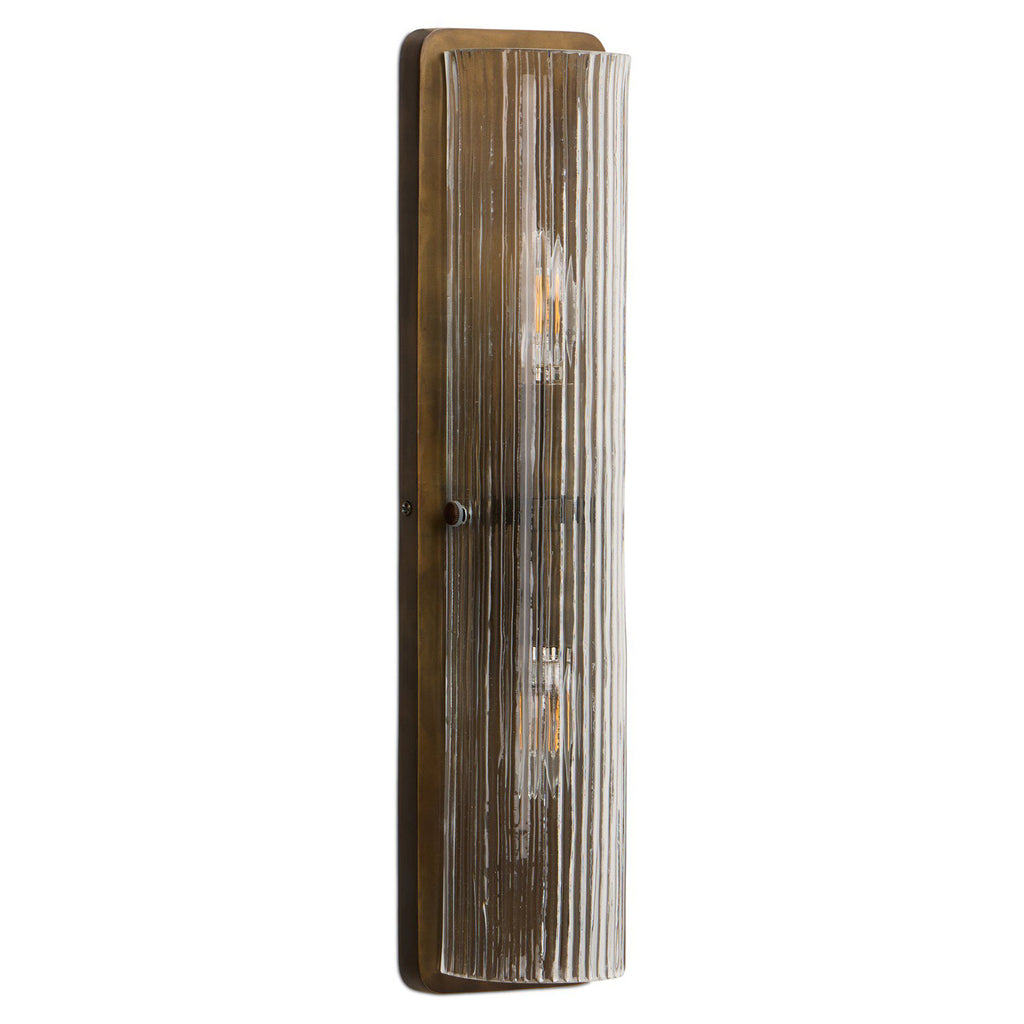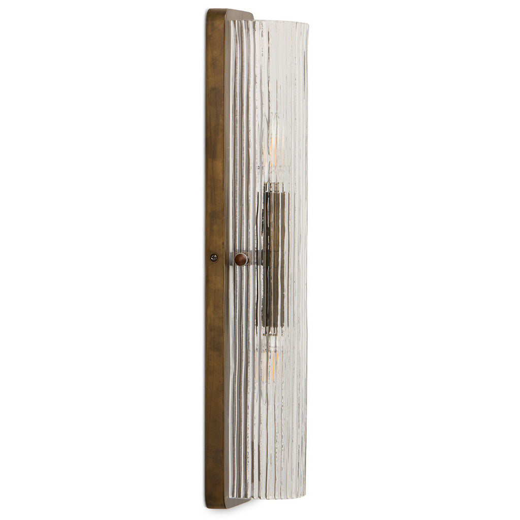 Clear reeded glass in a fluted design accommodates two light bulbs, one in each direction, for a reflective shine throughout. Flank a pair along the sides of a bathroom mirror. Metal backplate with bracket pins hold the glass in place.