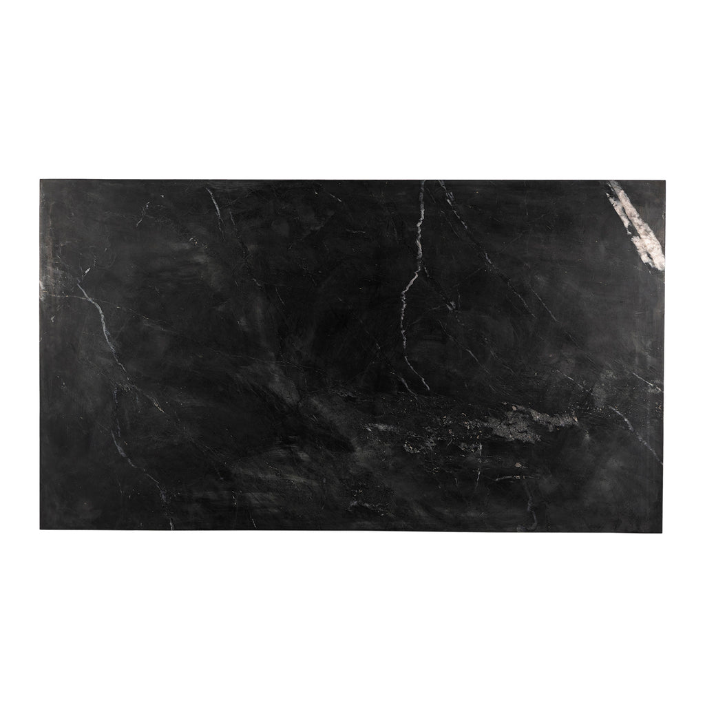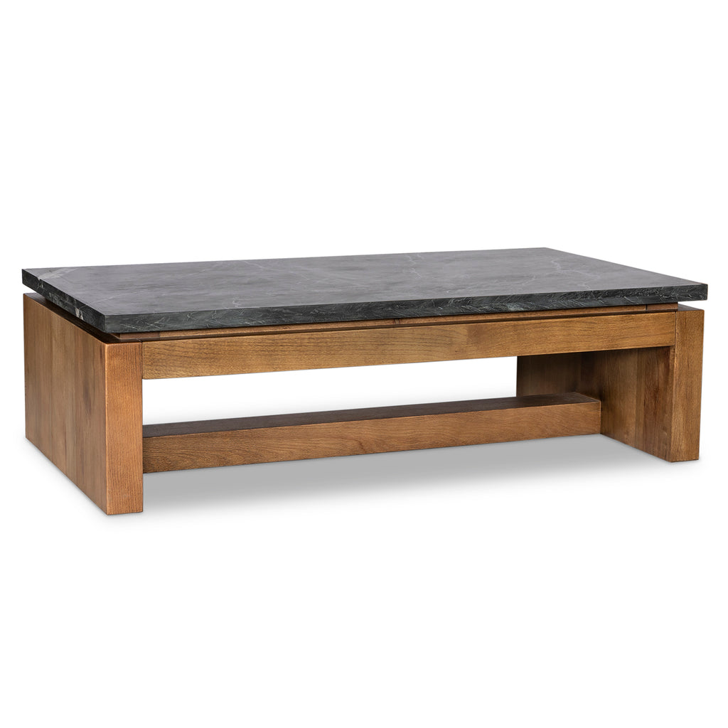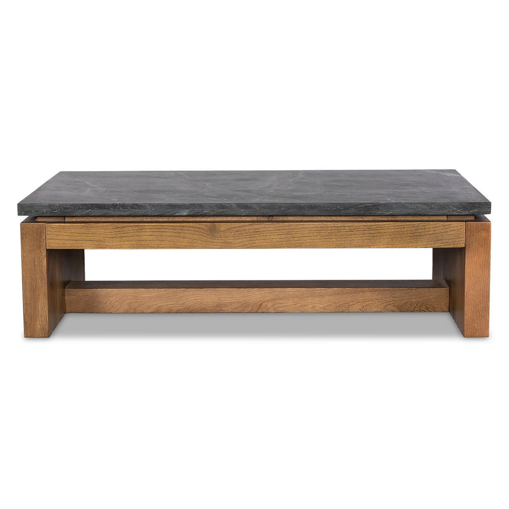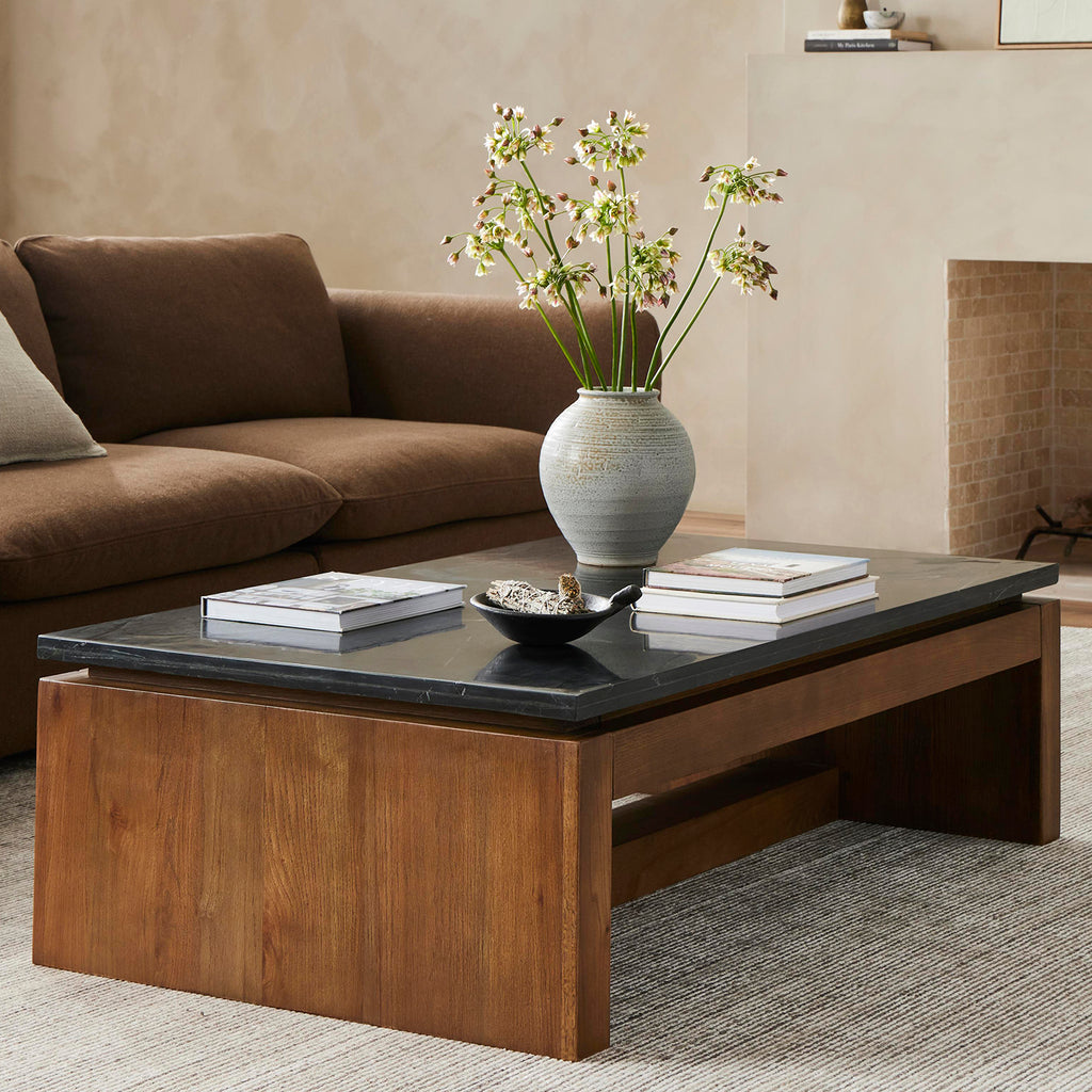 Mixed materials update this waterfall-style coffee table, as a warm oak base pairs with a sleek black marble tabletop.