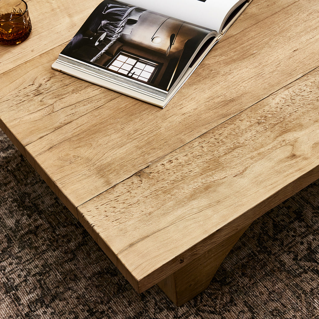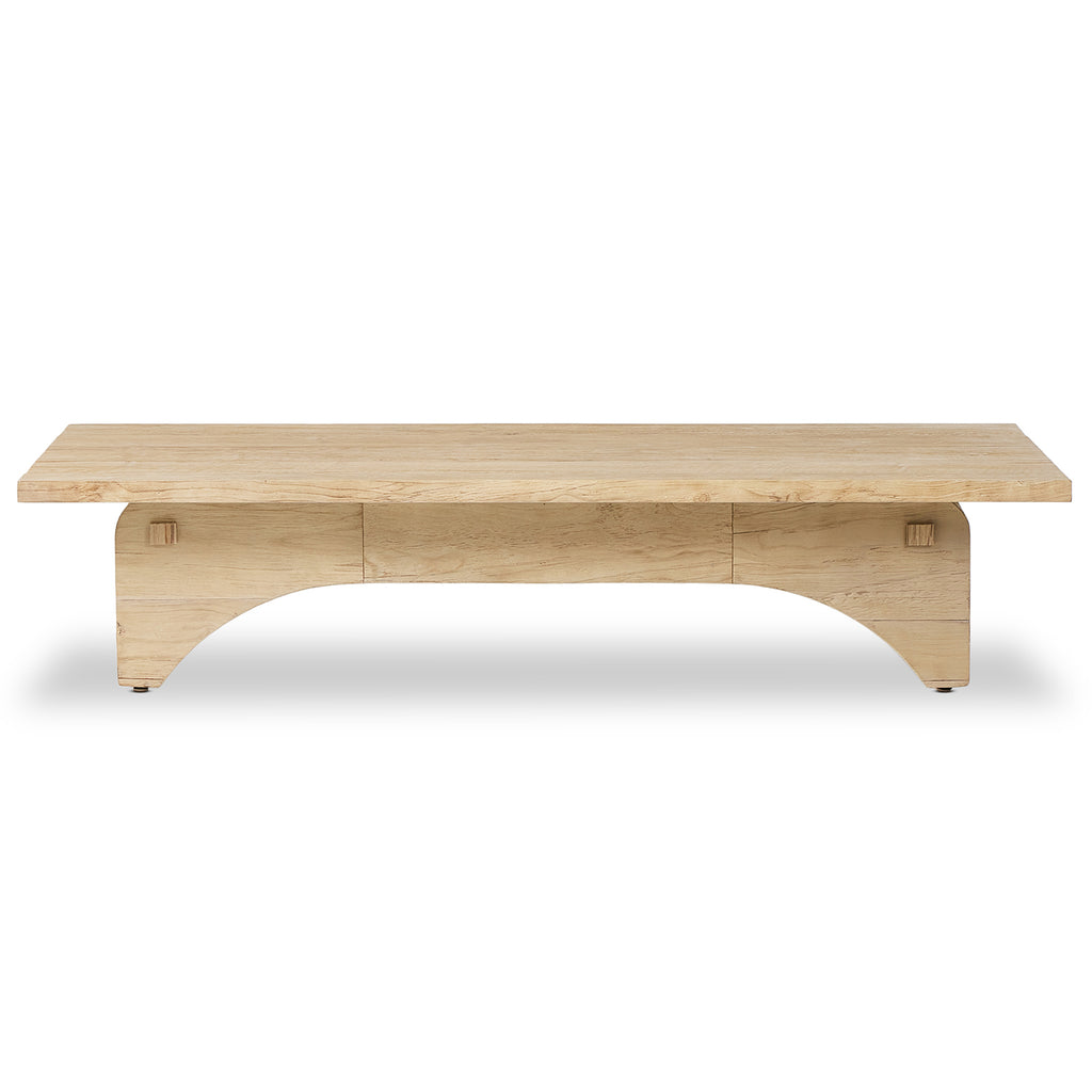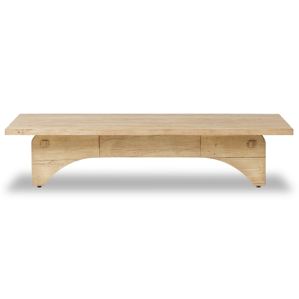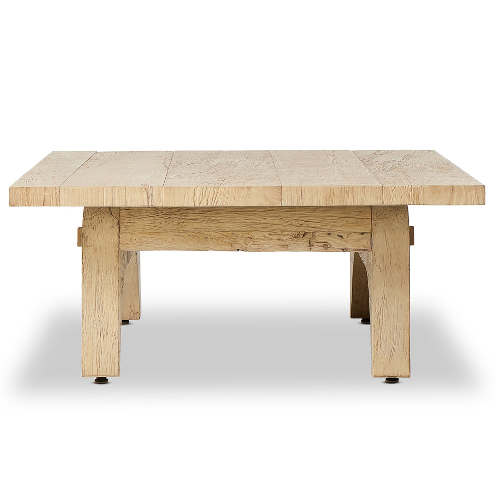 Bleached alder shapes a character-rich coffee table with Wabi Sabi vibes. Joinery pulls through stretchers, with groove detailing on legs, for an artisan feel.