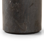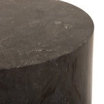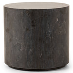 A cylinder-shaped end tables brings a shapely look to the living room. Made from natural polished bluestone for an organic look and feel.