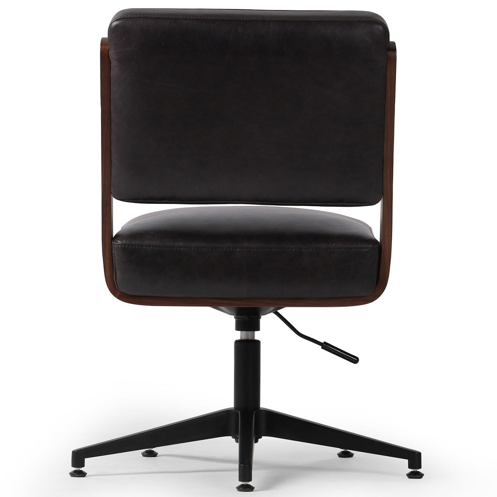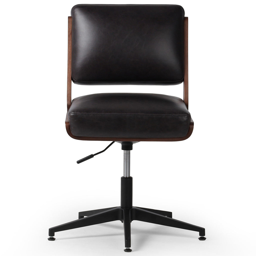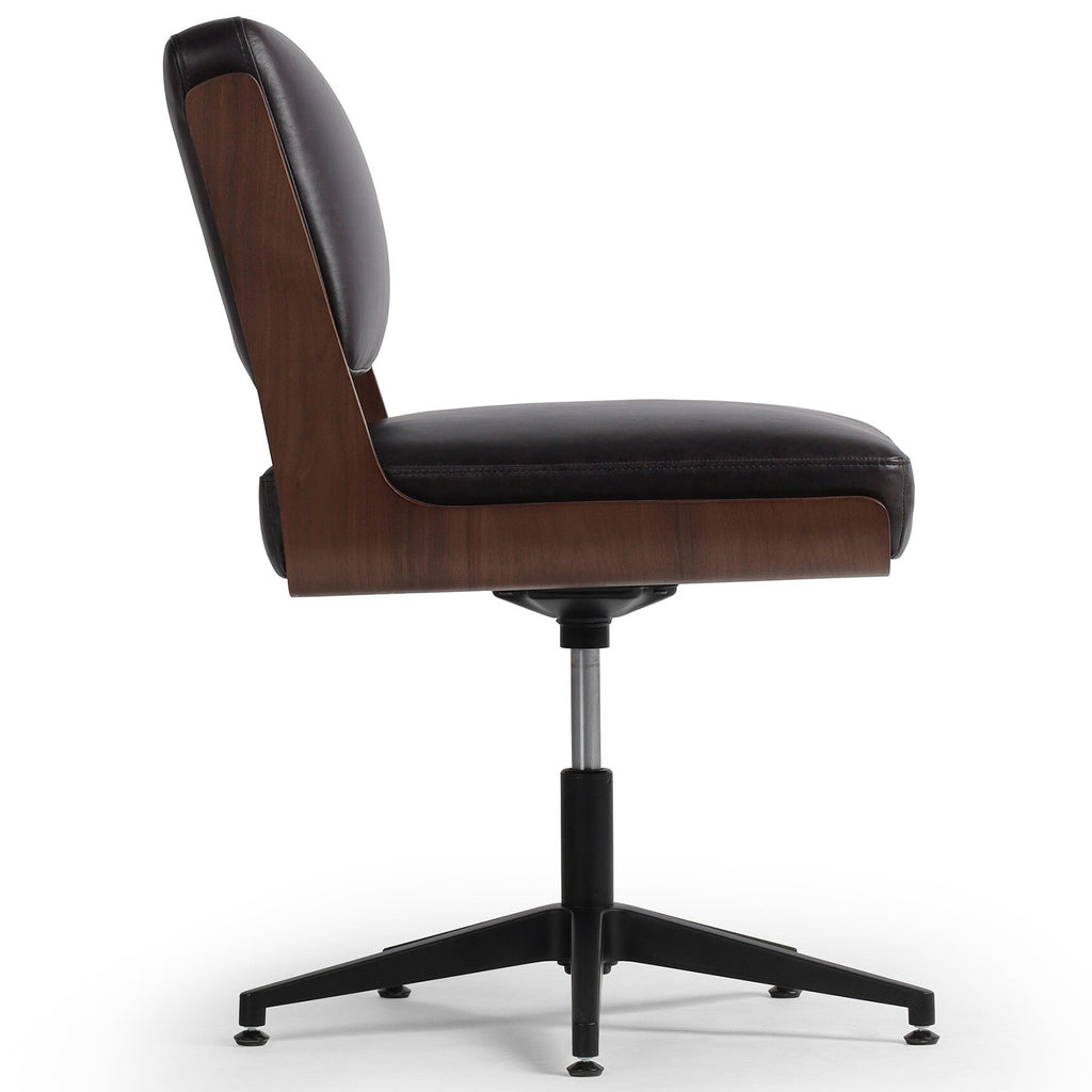 A nod to midcentury design, a molded wood frame veneered in rich walnut is paired with black top-grain leather cushions for maximum comfort. Height adjustable and 360-degree swivel function for ease in the workplace.