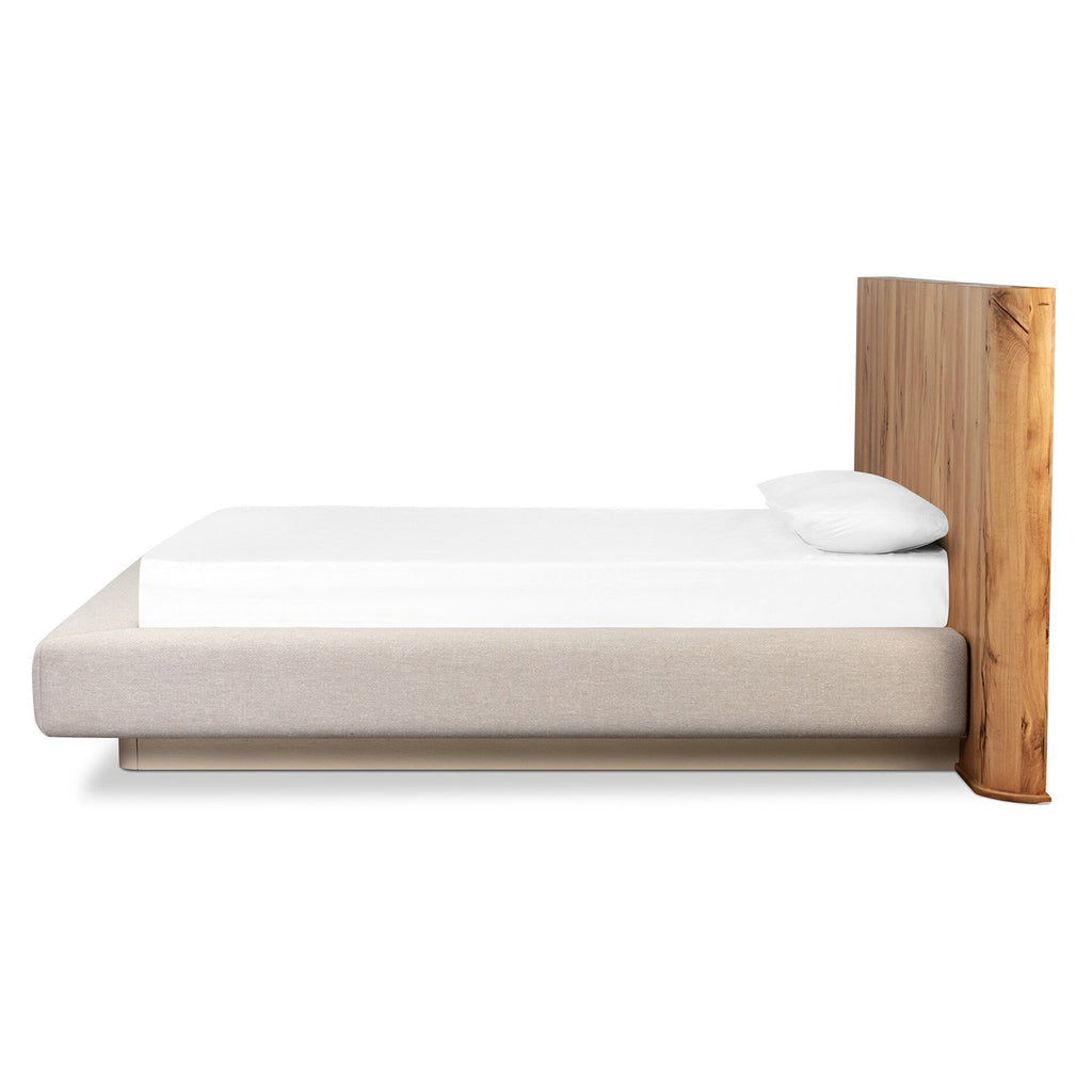 Designed by Thomas Bina and Ronald Sasson, a design partnership blending both modern minimalist and Brazilian influences. A true statement maker, this grand bed features an extra-wide, overhang headboard crafted of natural reclaimed French oak with subtle curves all around for a softened look. Plinth base is upholstered in a thick poly/flax/linen blend fabric.