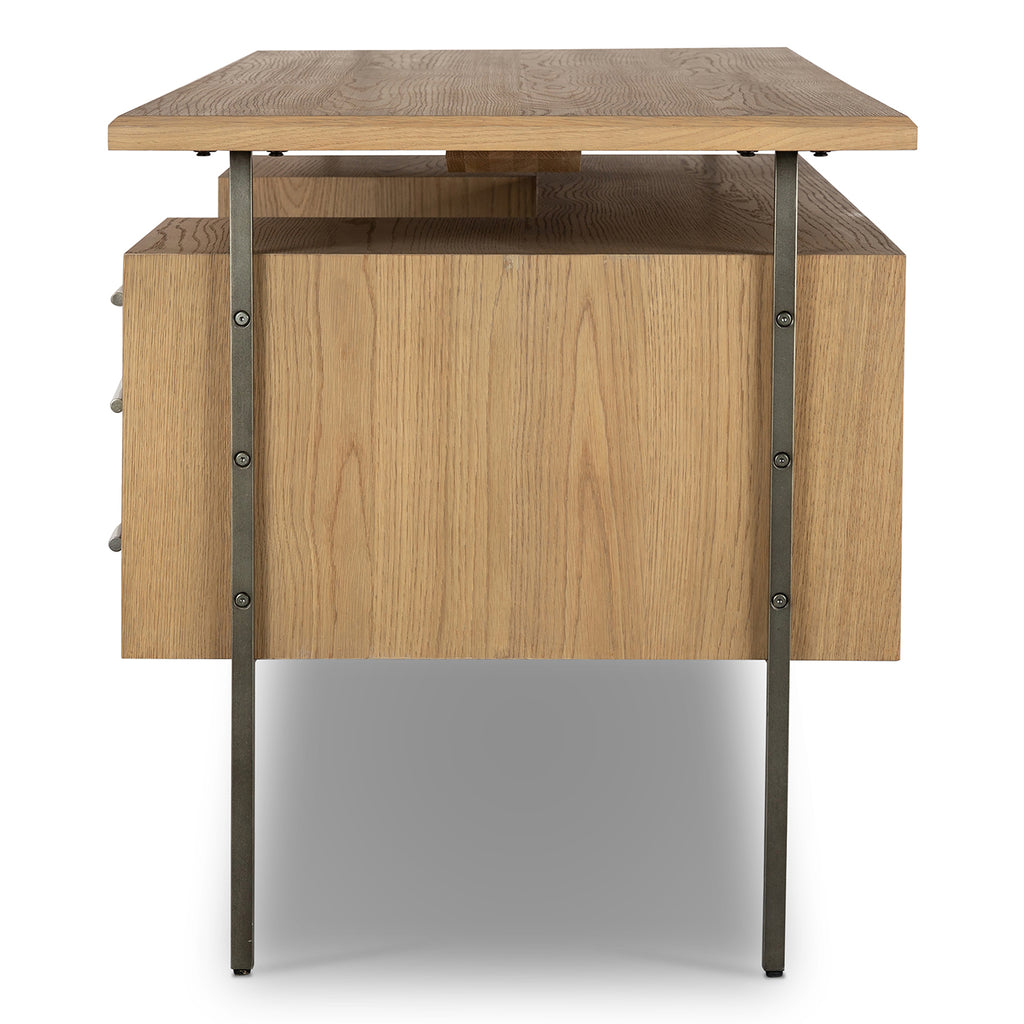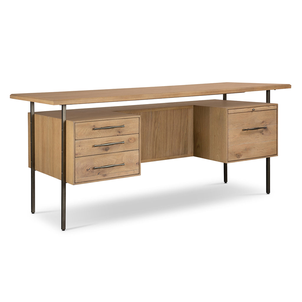 Midcentury modernized. Made from solid oak and reclaimed peroba, a legal-style desk offers major storage with dual cabinetry, including file storage for legal and letter-size documents. A floating top and iron legs keep the look modern and light.