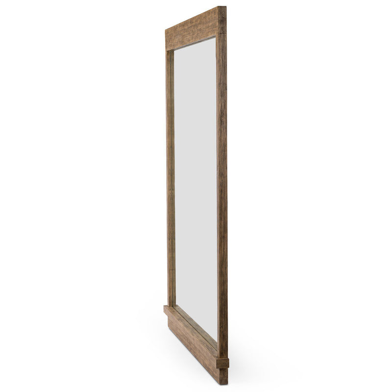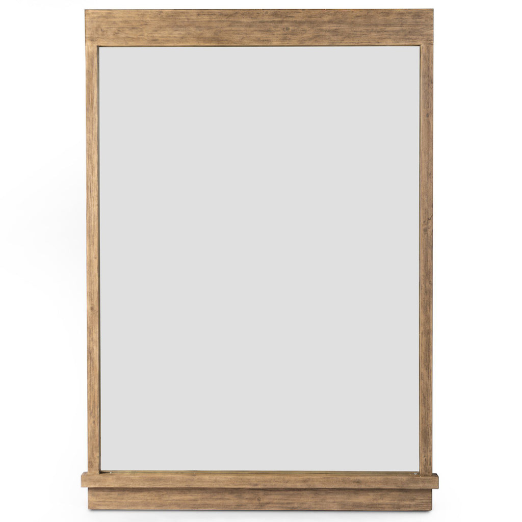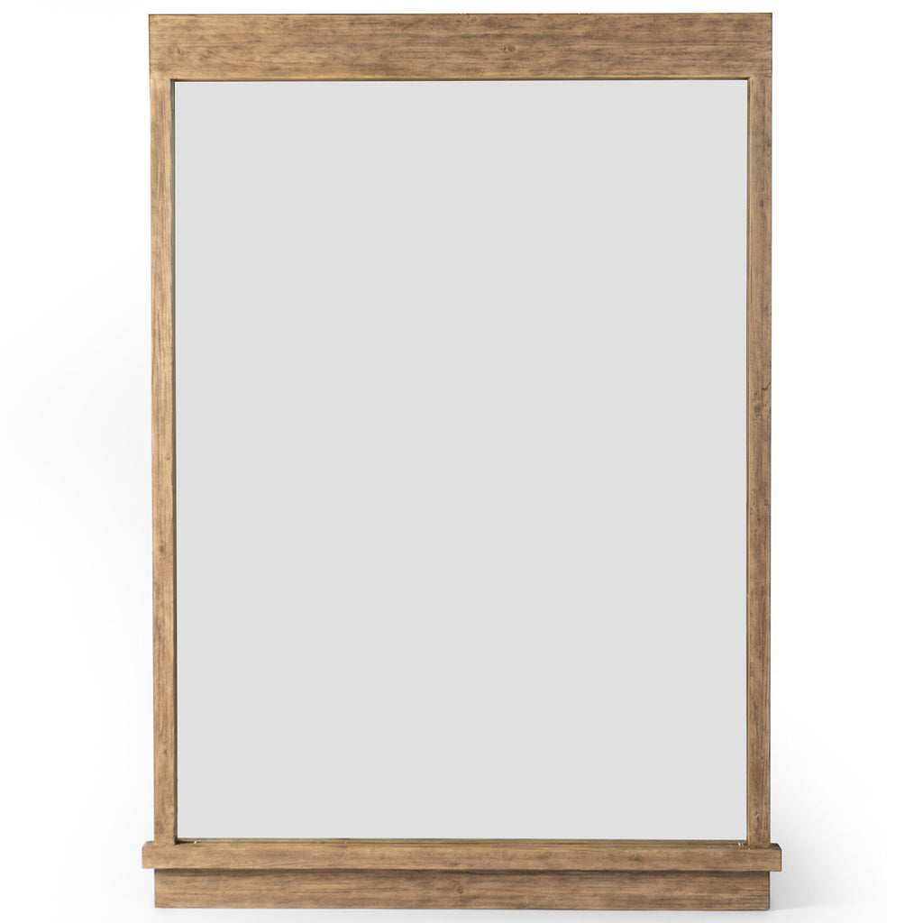 Classic and clean, the wide-format mirror is constructed from light, distressed pine and uses different frame thicknesses on top and bottom for a vintage feel. A ledge detail runs along the base of the mirror, reflecting an illusion of a larger surface. Create an artistic vignette by using the shelf to display miniature vases or found objects.