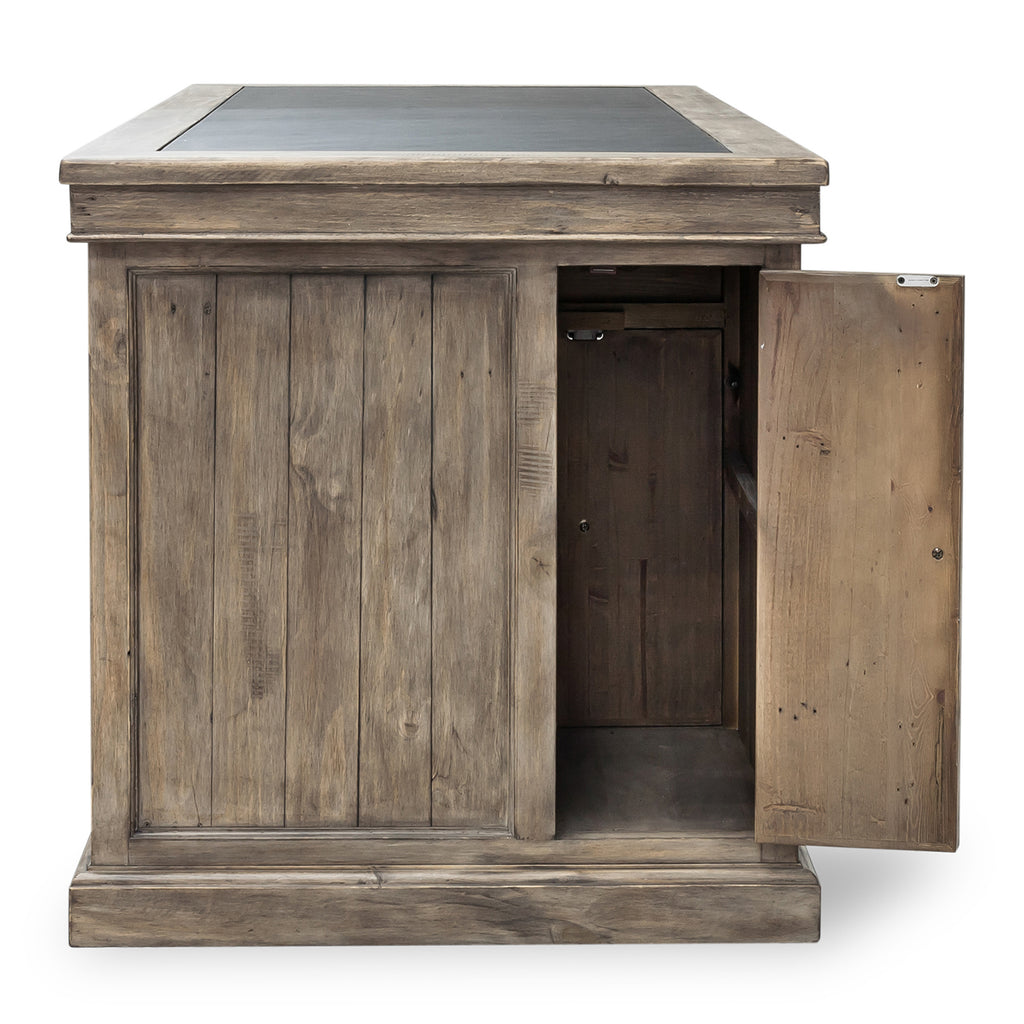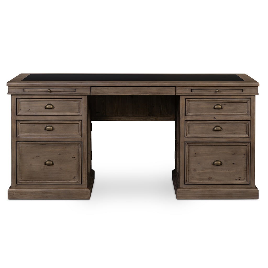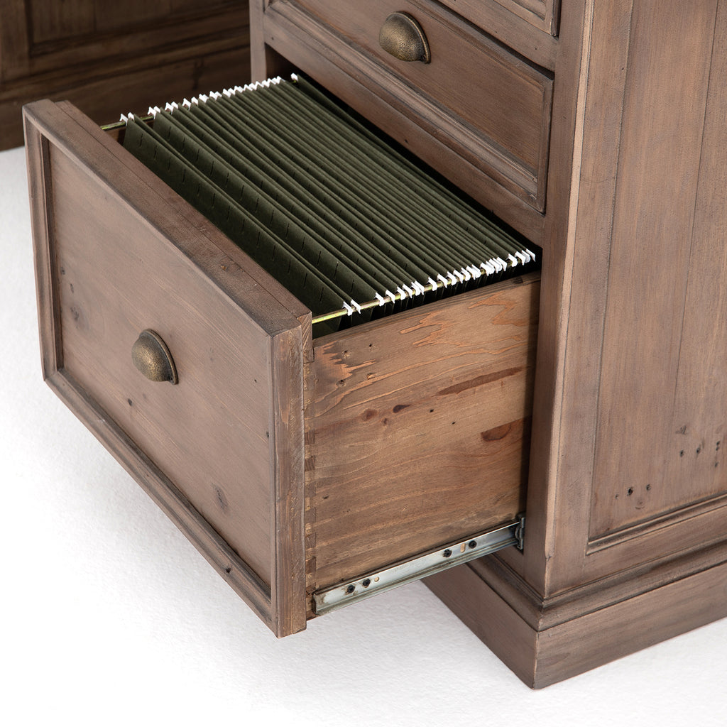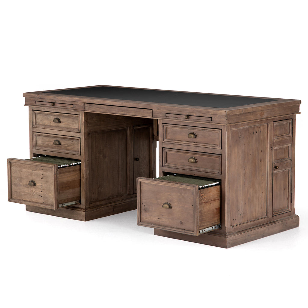 Borrowing inspiration from the classic lawyer's desk with an inlaid leather top and French-inspired detailing. Finished in warm, sun-dried wheat tones with cast brass hardware, with file dual file drawers for storage of legal and letter sized documents.