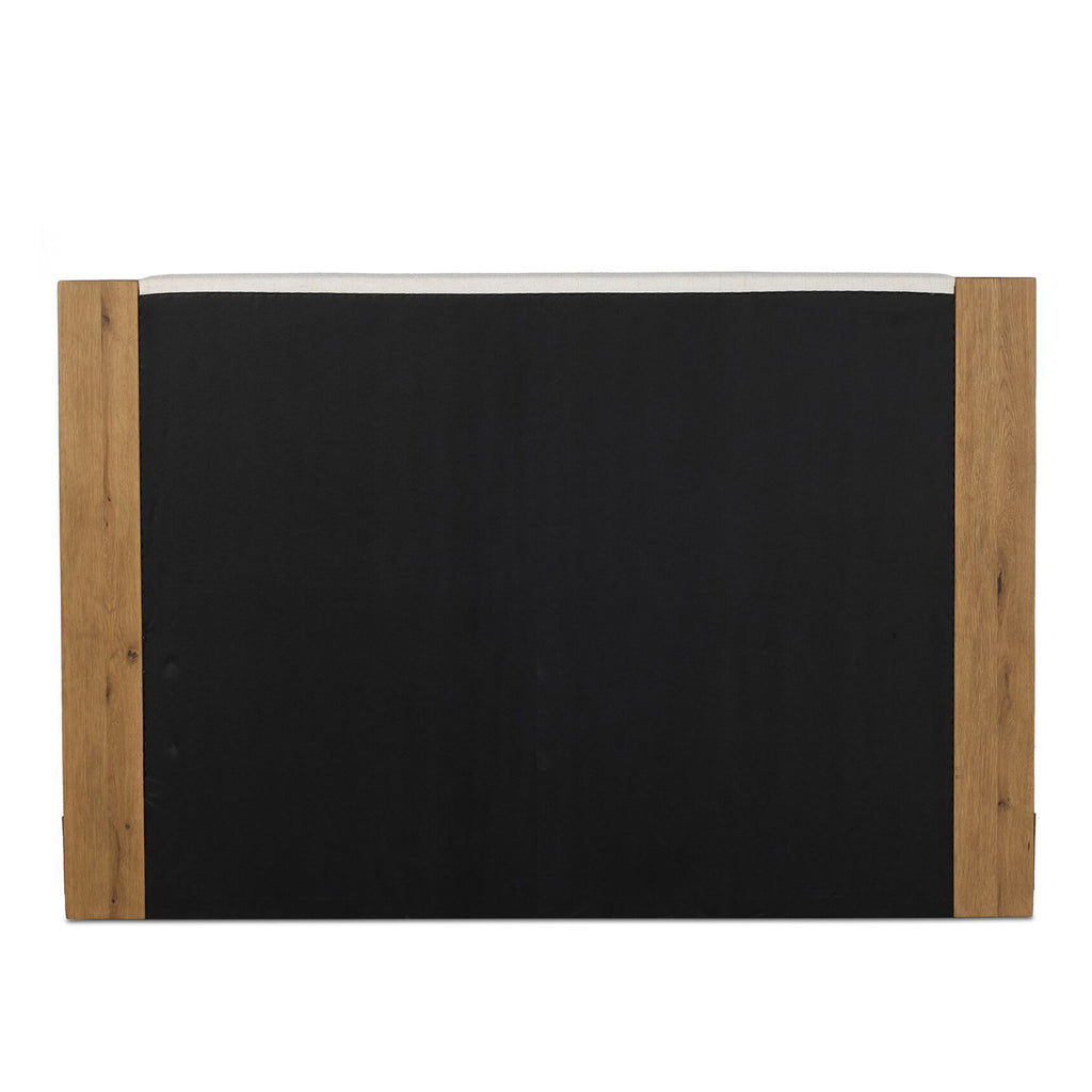 A woven, cushioned headboard in neutral cream adds texture around a floating platform base of light oak. Base features angular chamfered details, thick rails and footboard with a plinth base. Performance fabrics are specially created to withstand spills, stains, high traffic and wear, ensuring long-term comfort and unmatched durability.