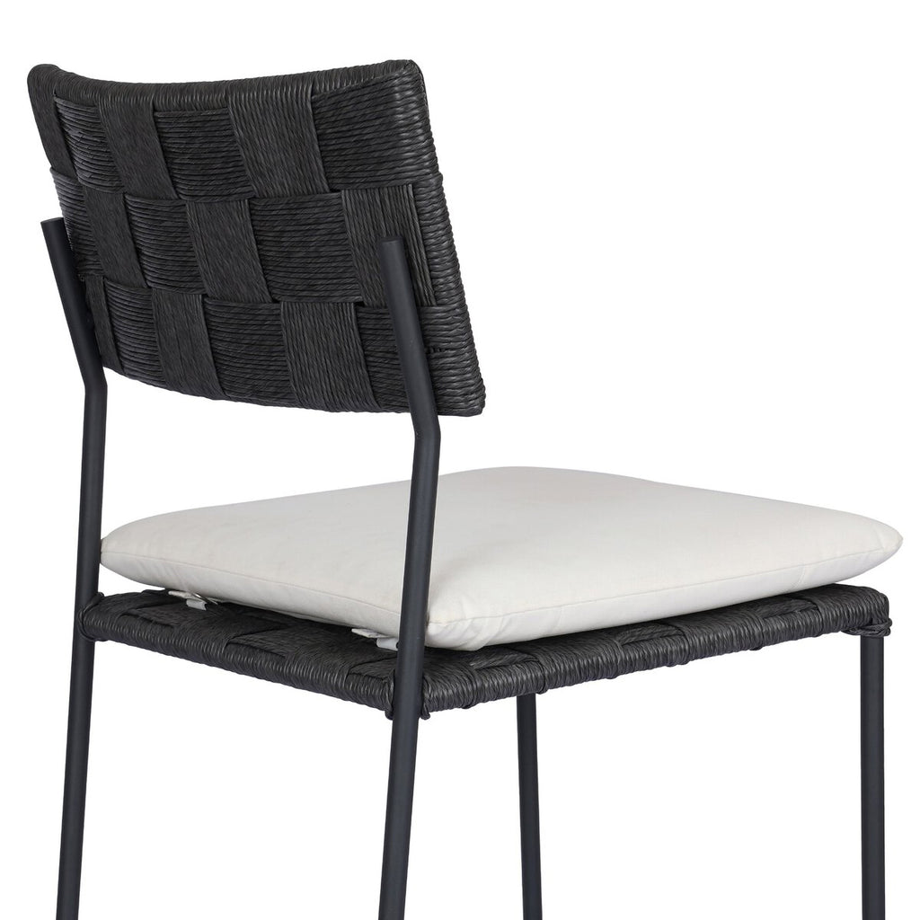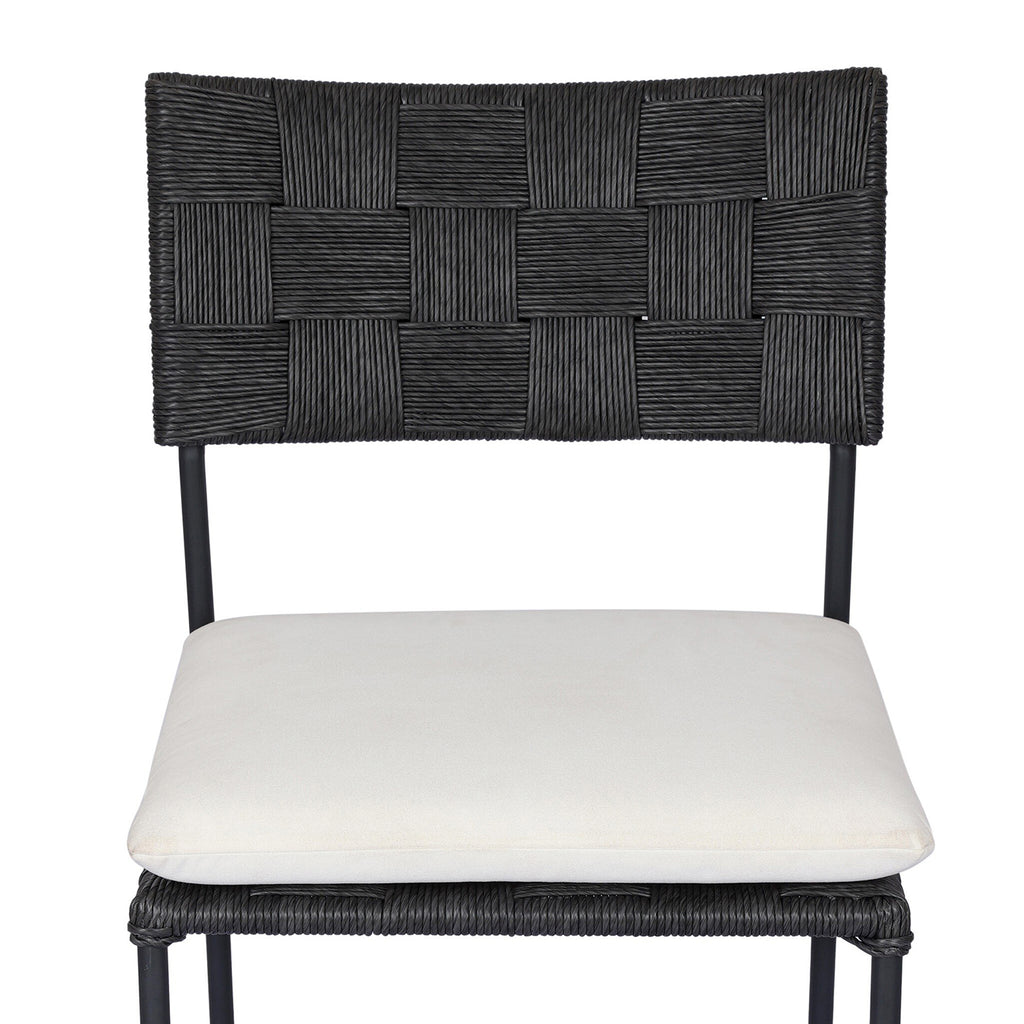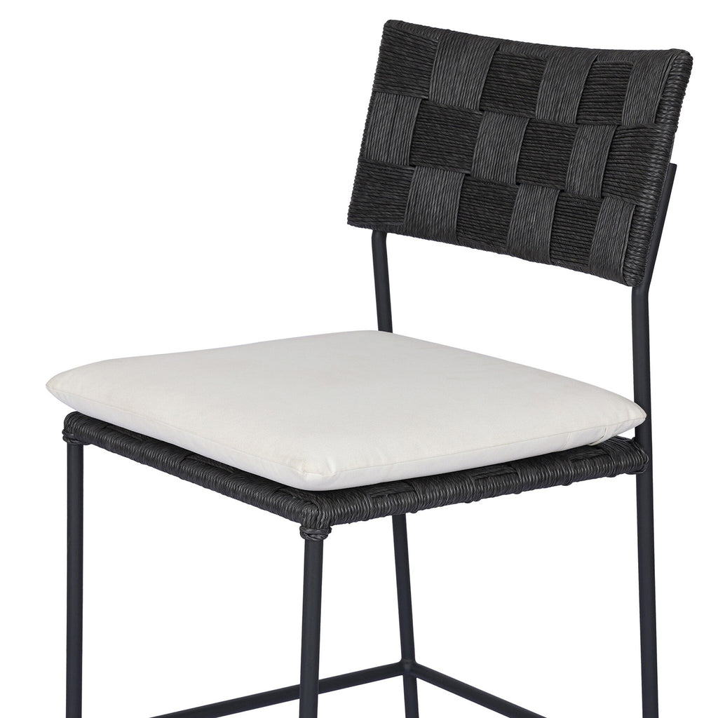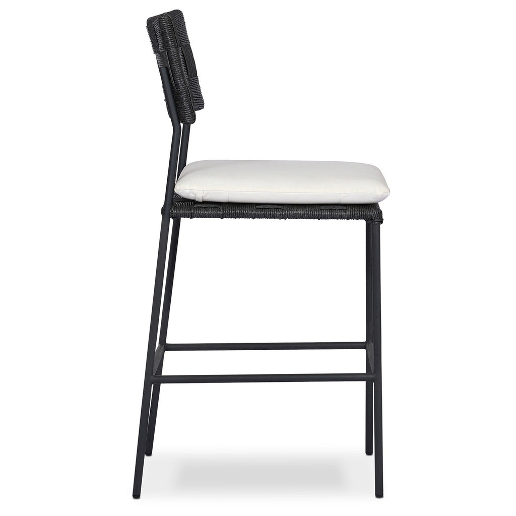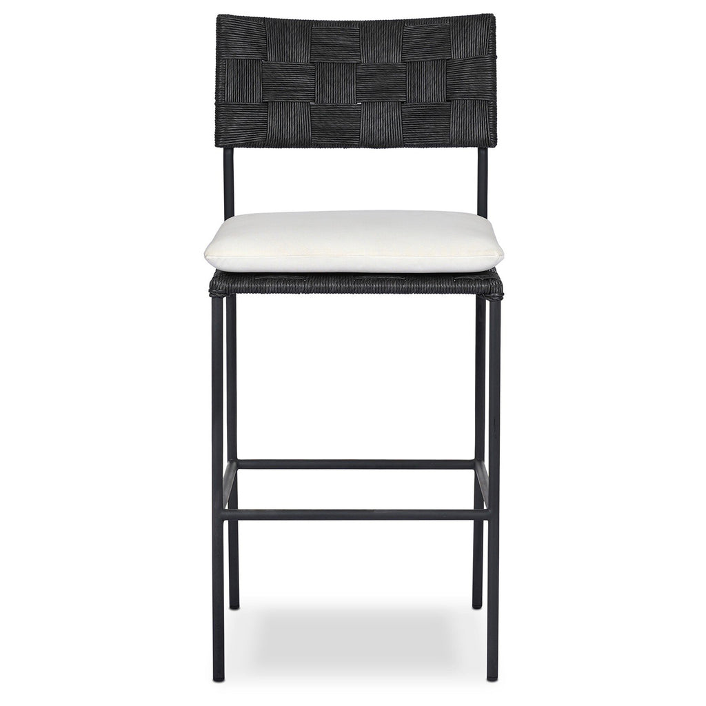 Classic shaping, updated materials and color contrast meet. A monochromatic chunky box weave on the seat and back balance the white cushion of this outdoor bar stool. Cover or store indoors when not in use or during inclement weather.