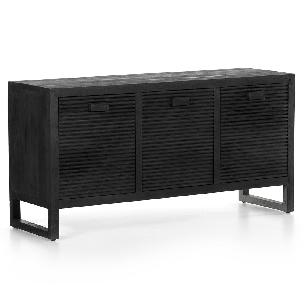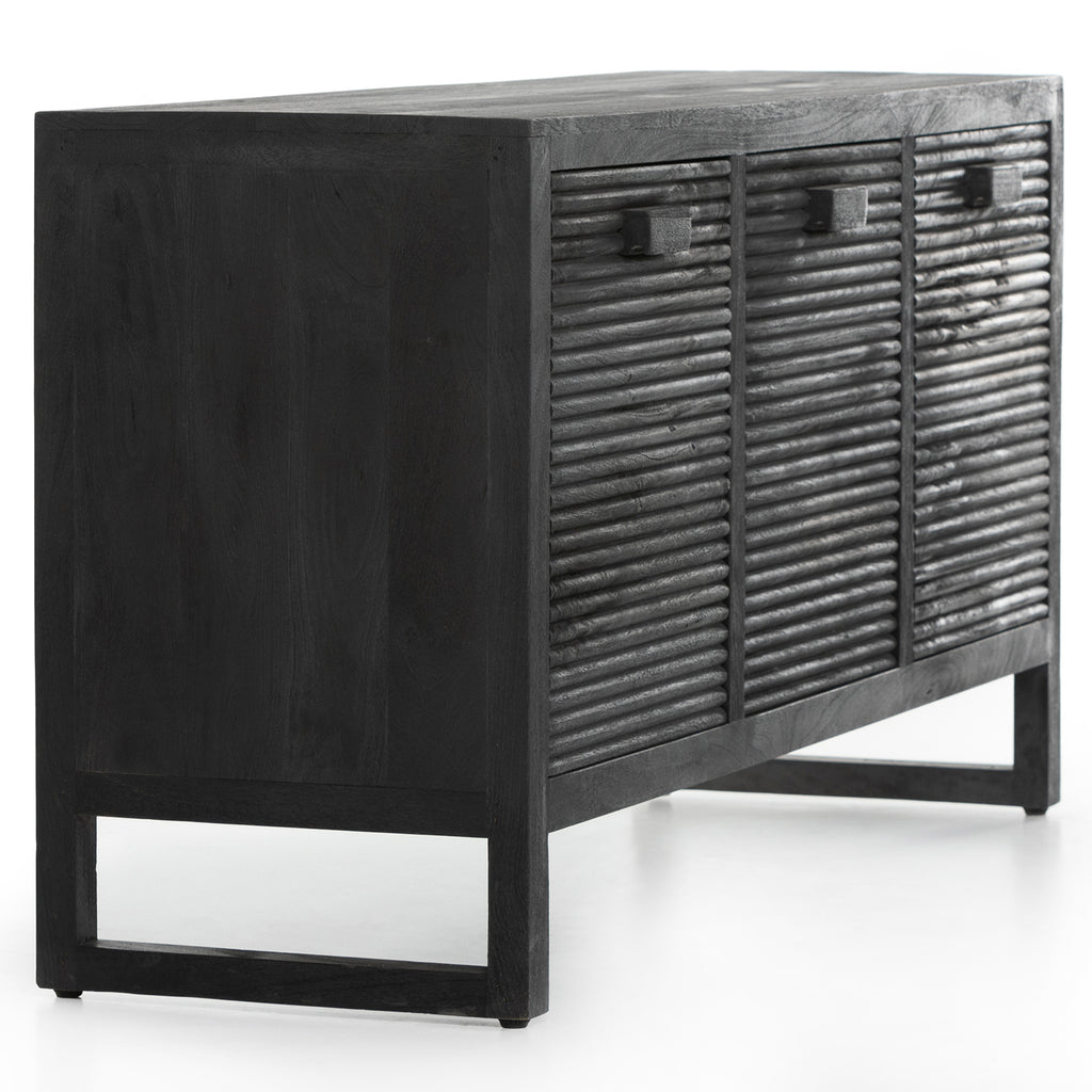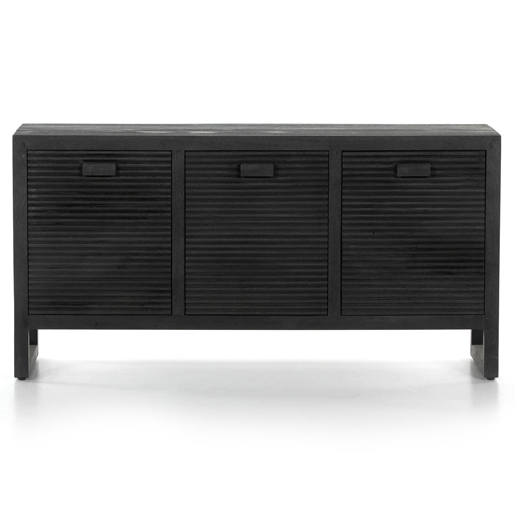 Finished reclaimed woods form a beautifully substantial console, with carved reeding for a linear look. Rear cutouts for cord management.