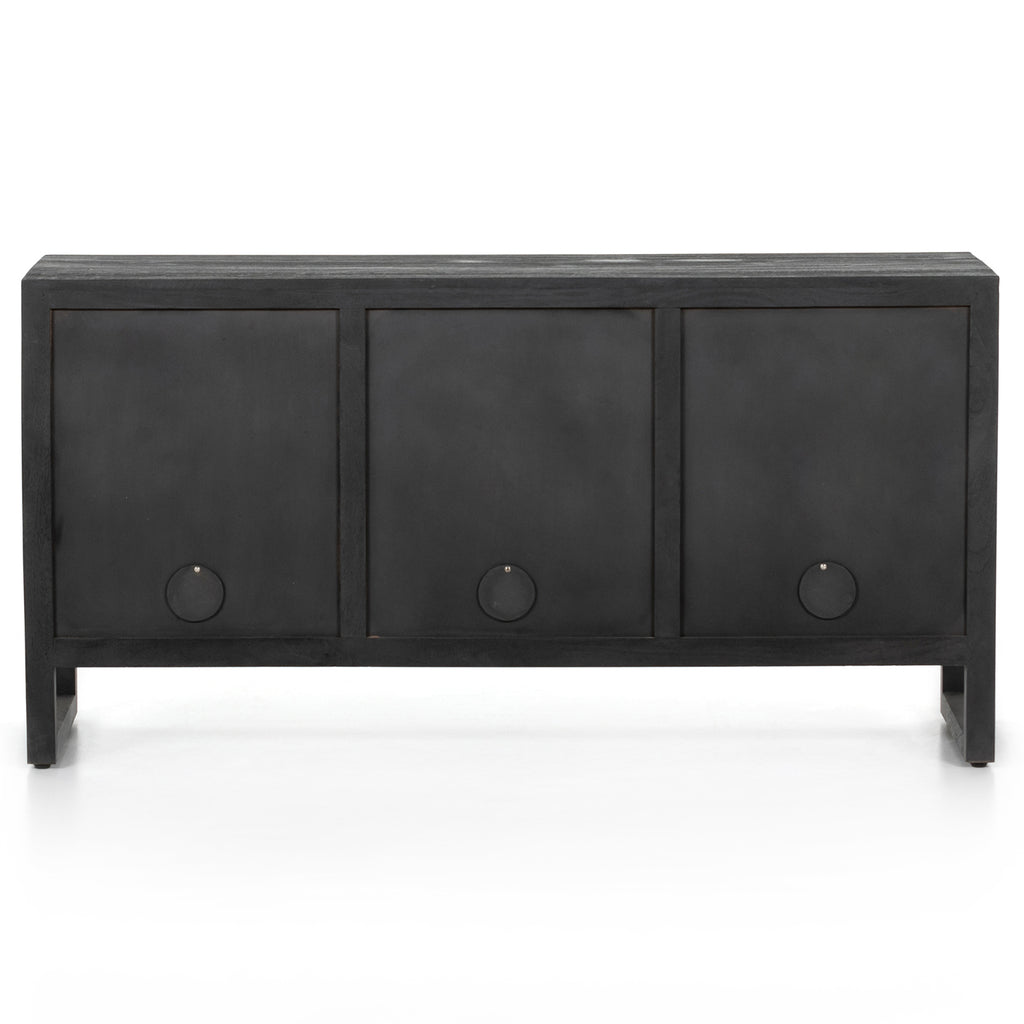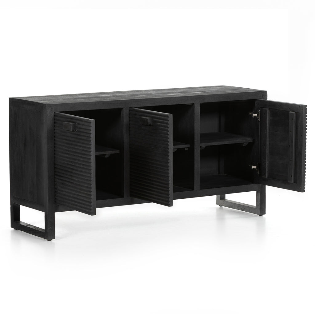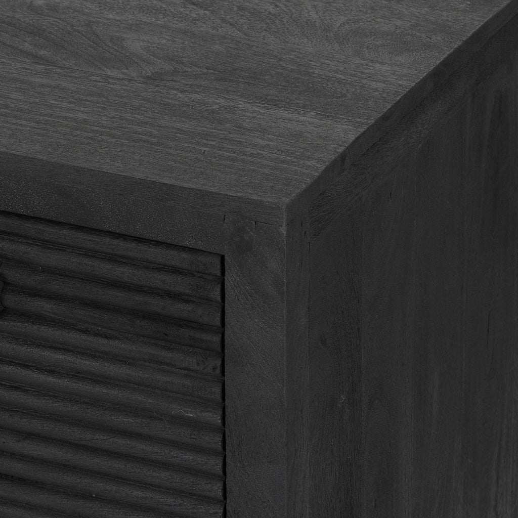 Finished reclaimed woods form a beautifully substantial console, with carved reeding for a linear look. Rear cutouts for cord management.