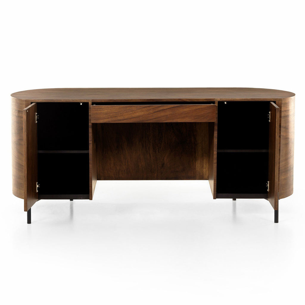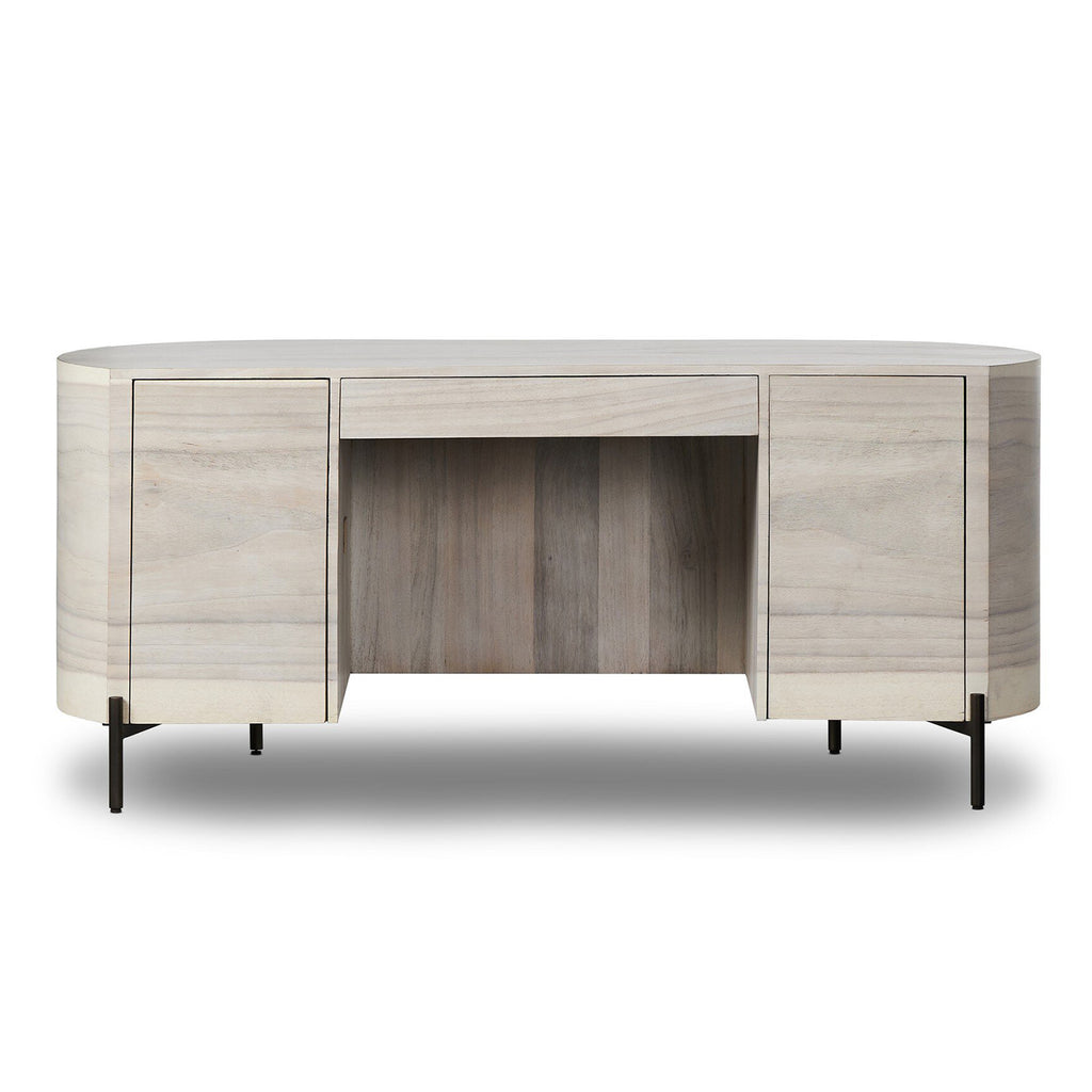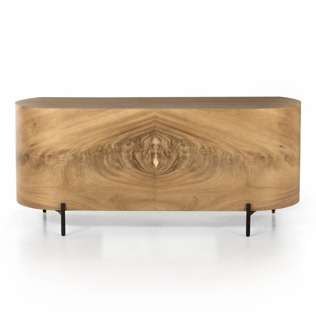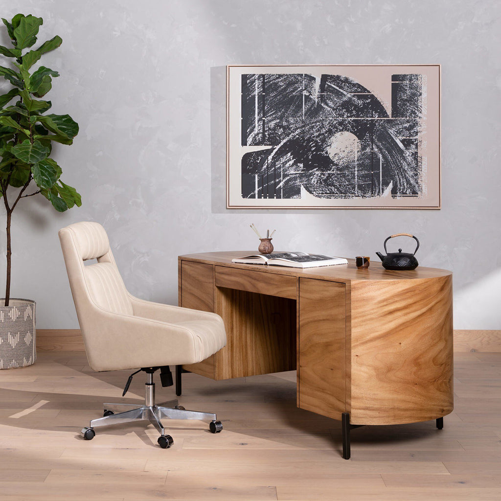 With soft, fluid shaping,bleached, gold or caramel-colored Guanacaste forms a beautifully sculpted silhouette, with natural high and lowlights coursing the entirety of this unique executive desk. Dual push-latch doors plus interior shelving offer ample storage space, while a fully finished front and back offer the option for float styling within a room.