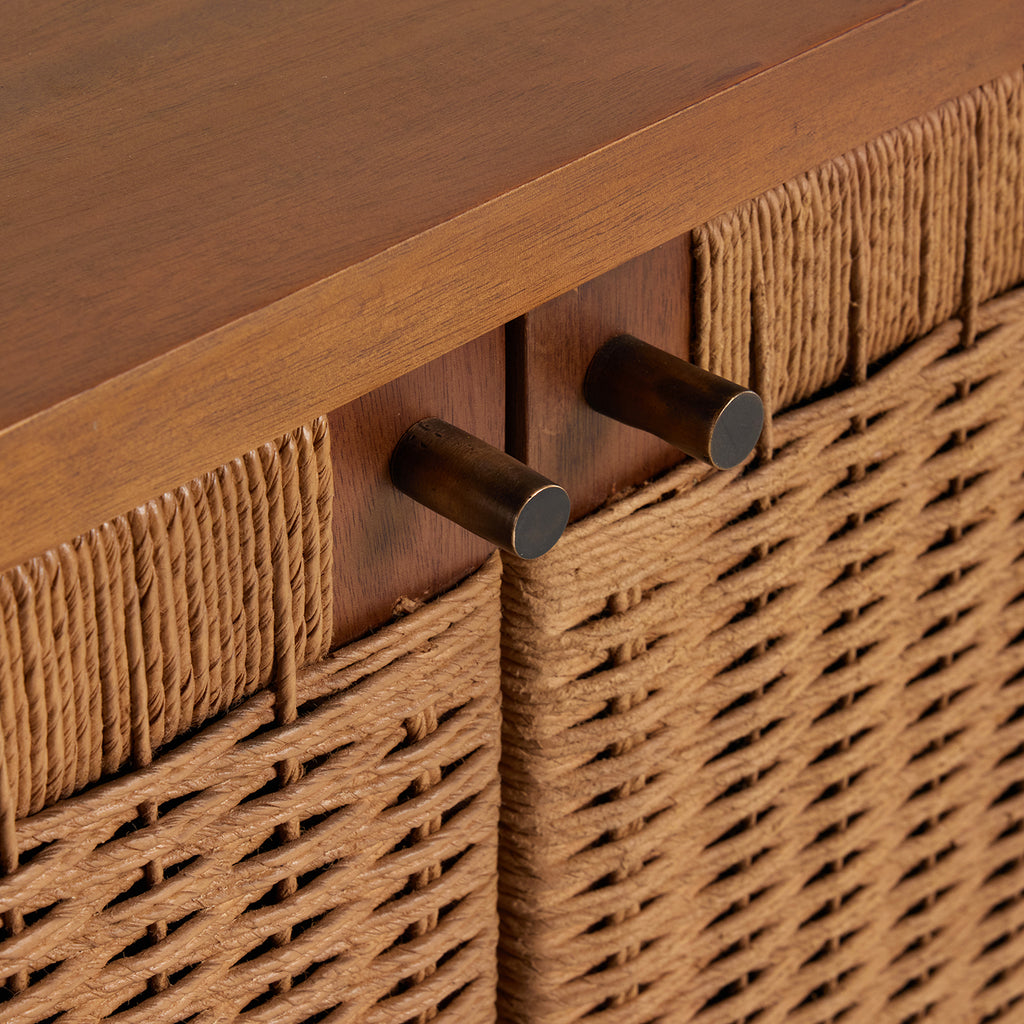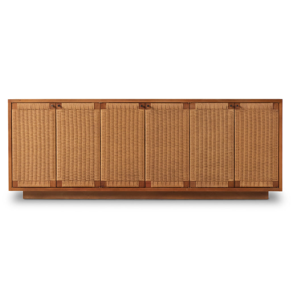 Danish midcentury, modernized. Light-finished mahogany forms clean casing and a plinth-style base, with doors of woven paper cord for a high-texture touch.