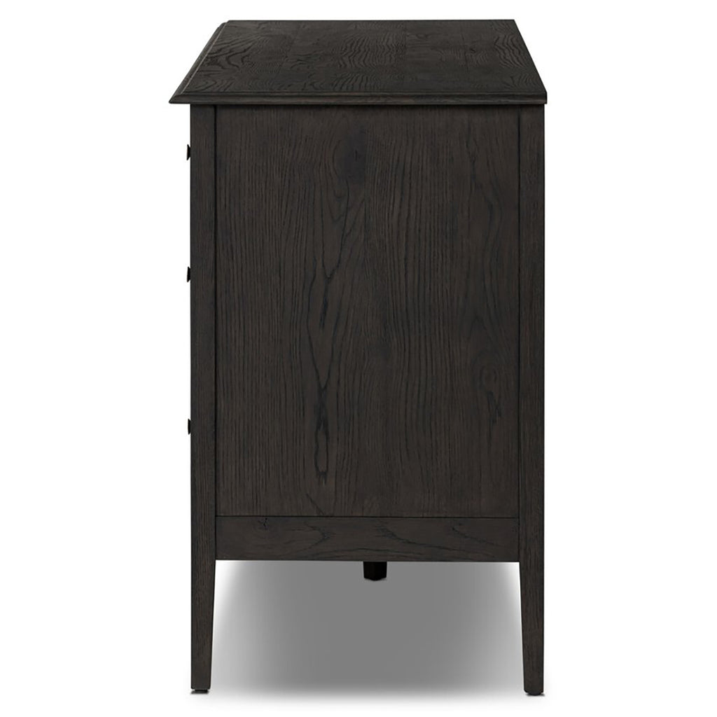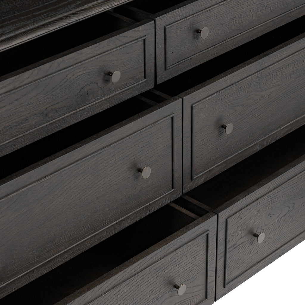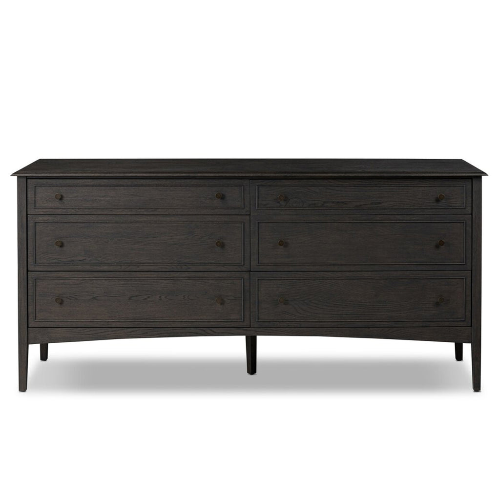 A cleanly shaped six-drawer dresser is crafted from aged smoked oak, highlighting the wood's natural grain. Roomy drawers offer plenty of space for bedroom storage, while the slim, tapered legs give the piece a subtle lift, creating a grounded look.