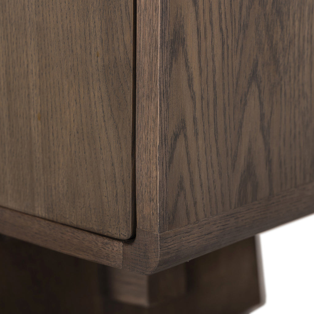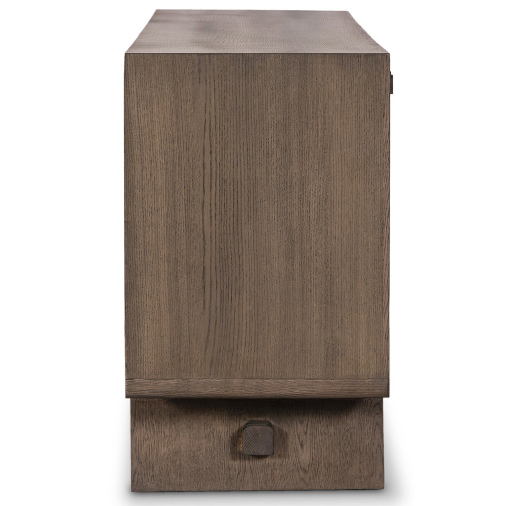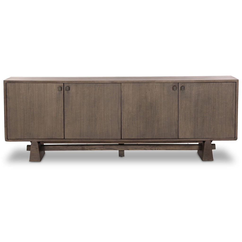 A subdued statement piece with midcentury vibes. Aged natural oak doors conceal ample space, complete with shelving for dining storage and more.