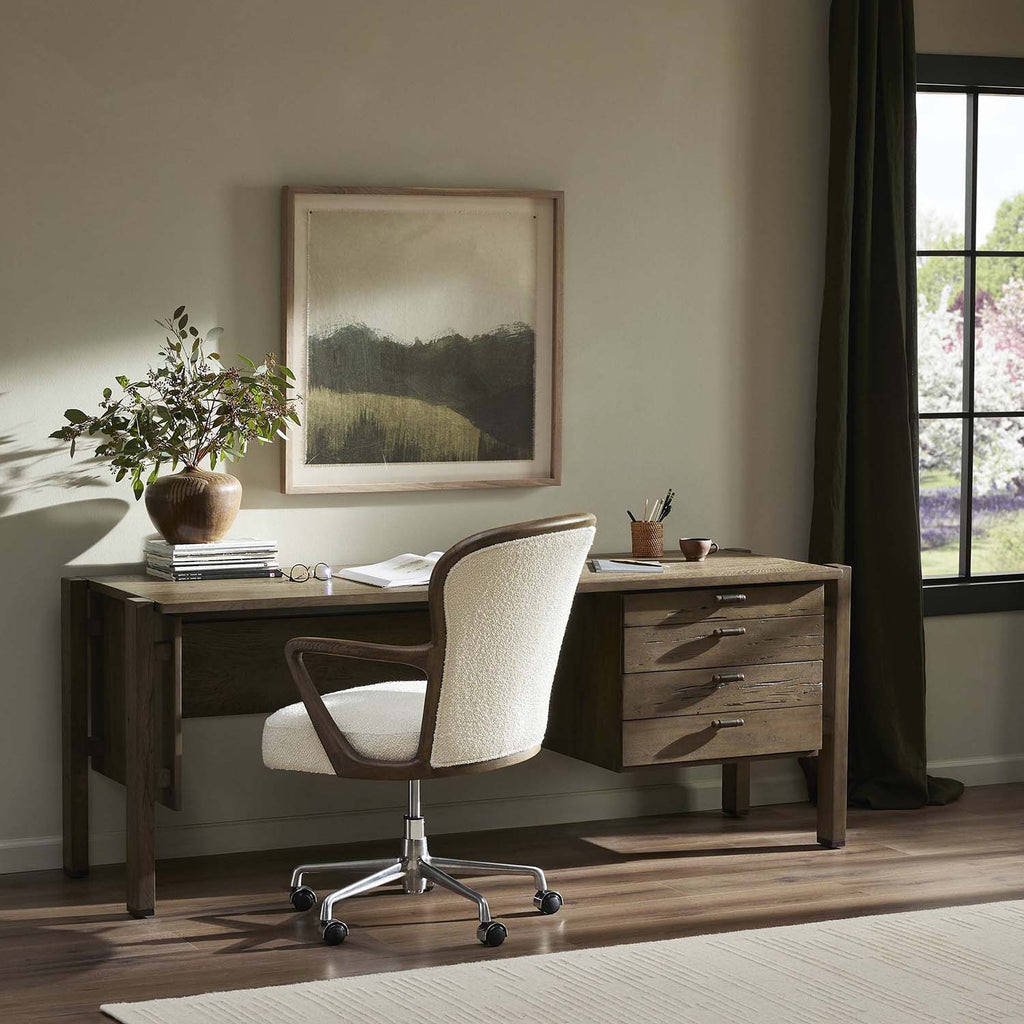 Made from reclaimed French oak, a unique open frame design crafts a light look, while dark brass hardware adds warmth. Versatile grey finish, plus four drawers for generous storage space. Designed in partnership with longtime Four Hands collaborator Thomas Bina and Brazilian designer Ronald Sasson.
