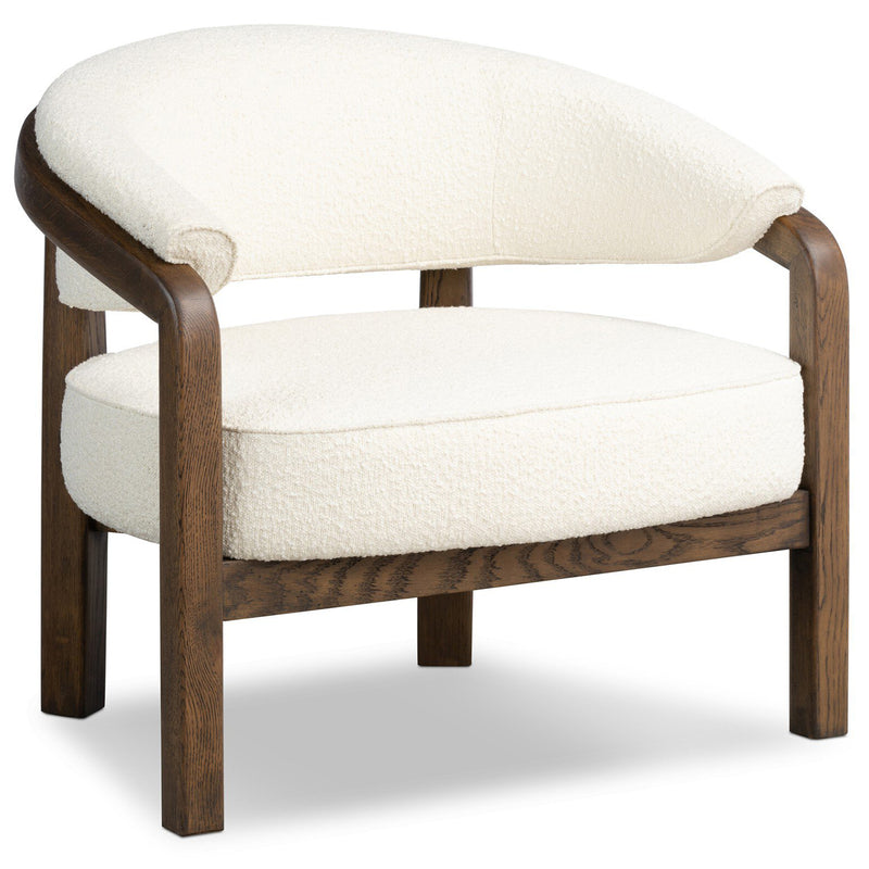 This floating wrap chair features an exposed wood profile that cradles seat and back cushions. The frame feels fluid, as it travels from the ground to the upholstered back rest and back down through the hind legs. Spring suspension ensures stylish comfort.