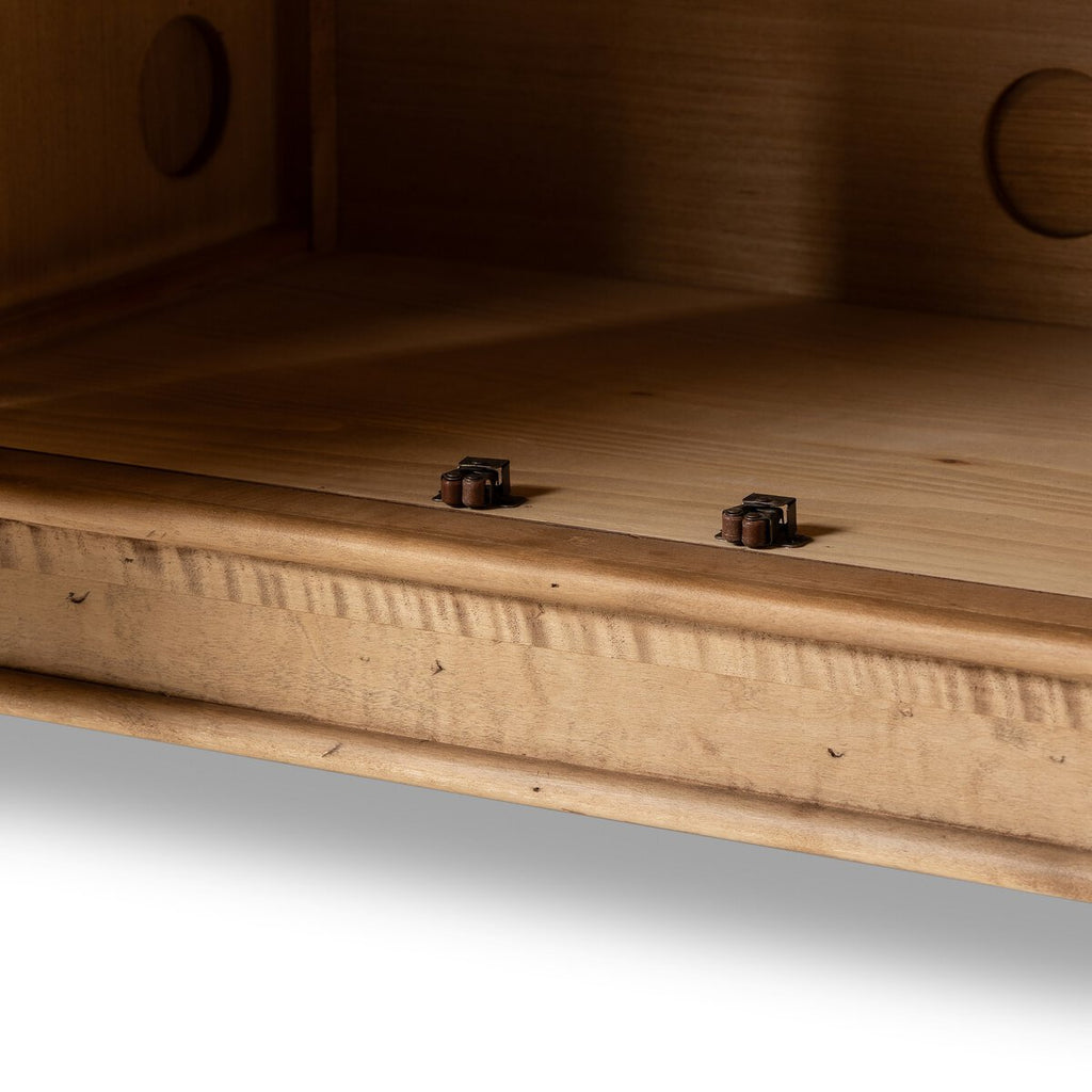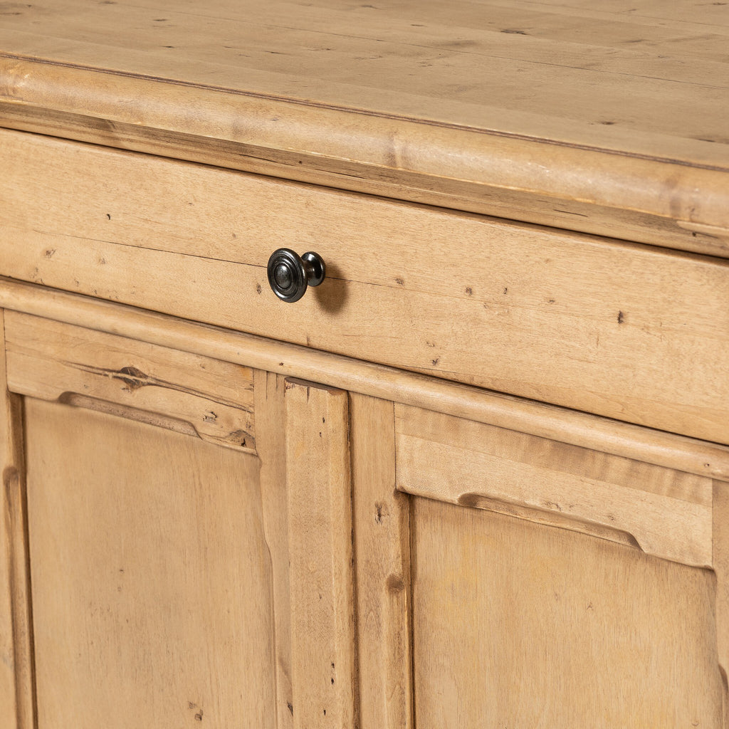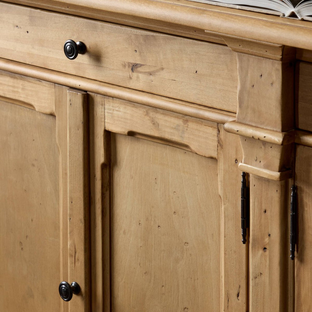 Inspired by European antiques, this solid pine sideboard features classic molding and detailing with distressed copper hardware for an authentic heirloom look and feel. Grand in scale with plenty of interior storage including two top drawers. Rear cutouts for cord management.