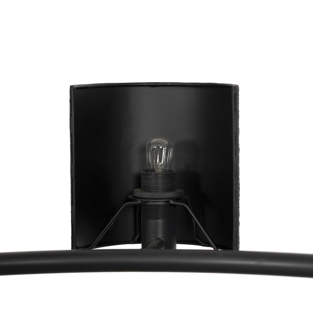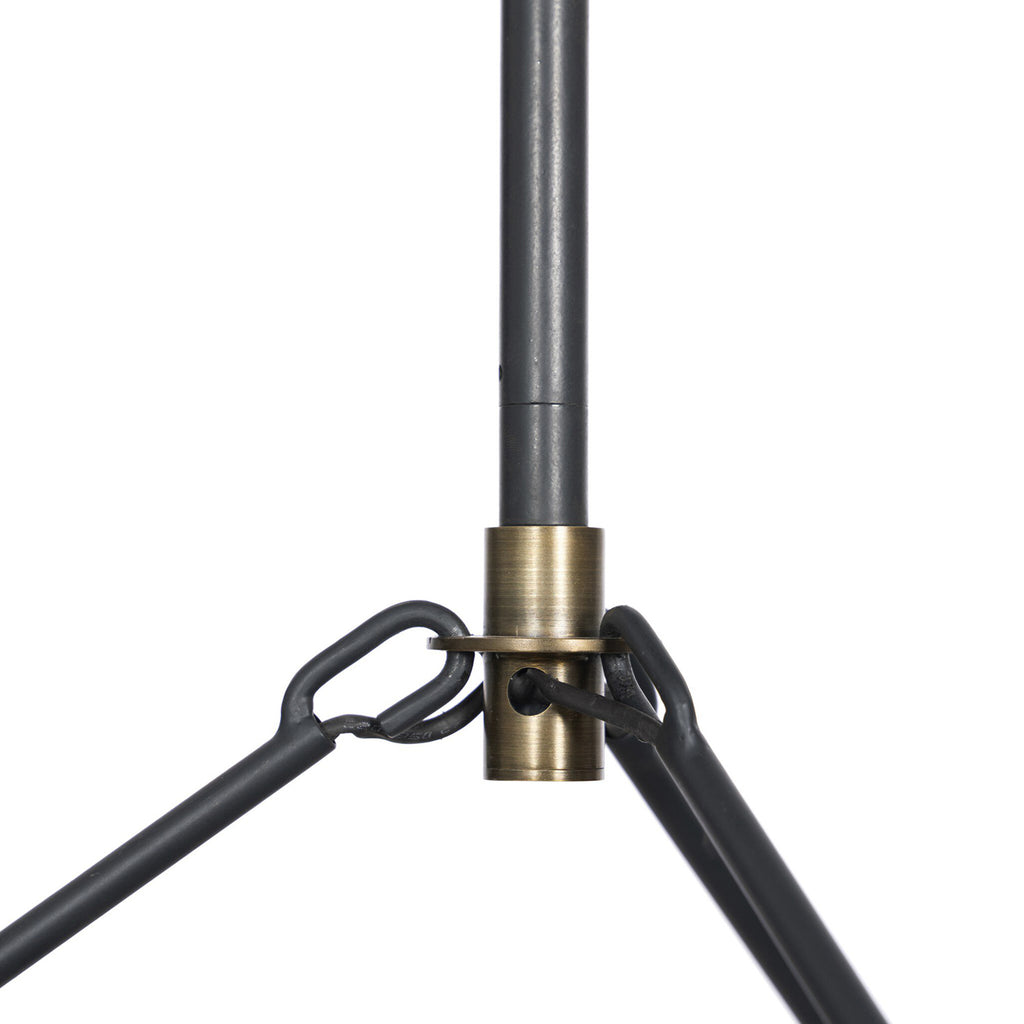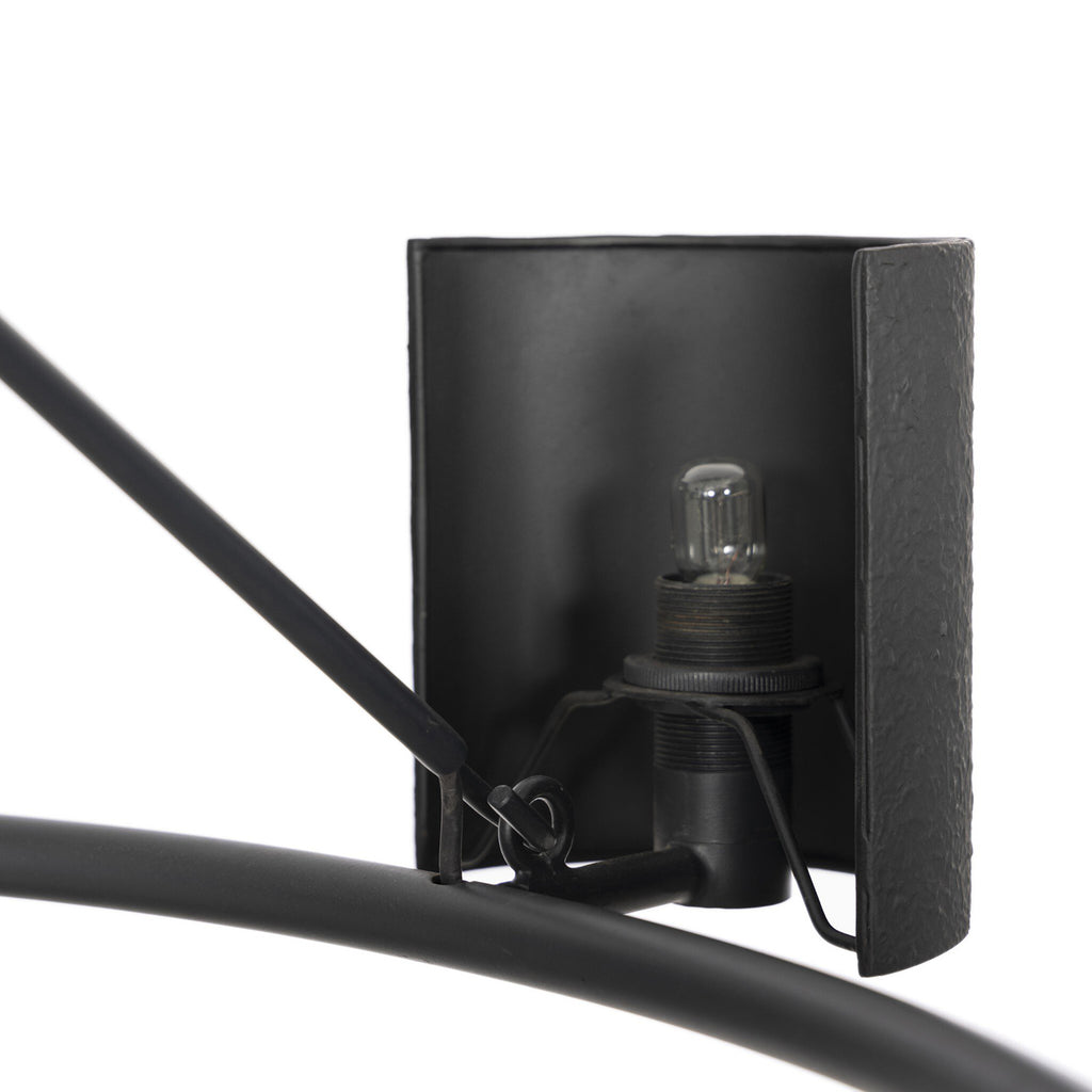 Craft drama in any space. Long, slim iron stretchers secure curved black shades, creating soft beams of light from all directions. Can be suspended from a slanted ceiling.
