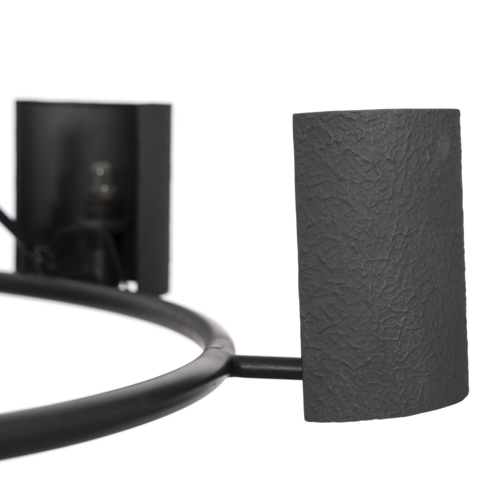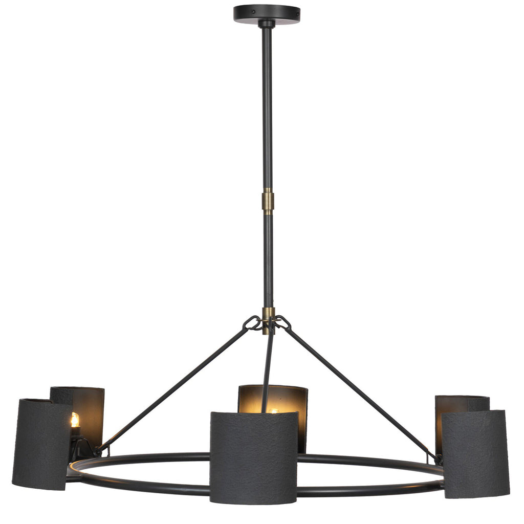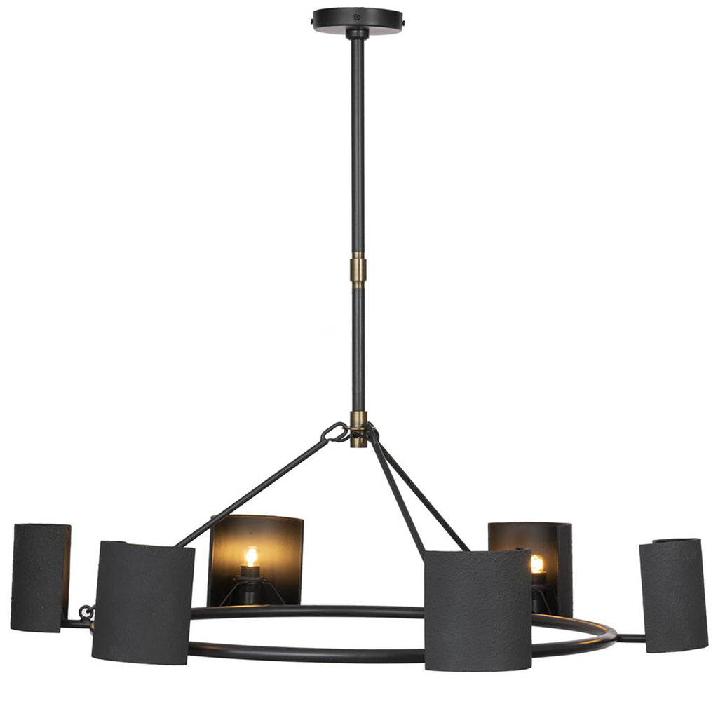 Craft drama in any space. Long, slim iron stretchers secure curved black shades, creating soft beams of light from all directions. Can be suspended from a slanted ceiling.