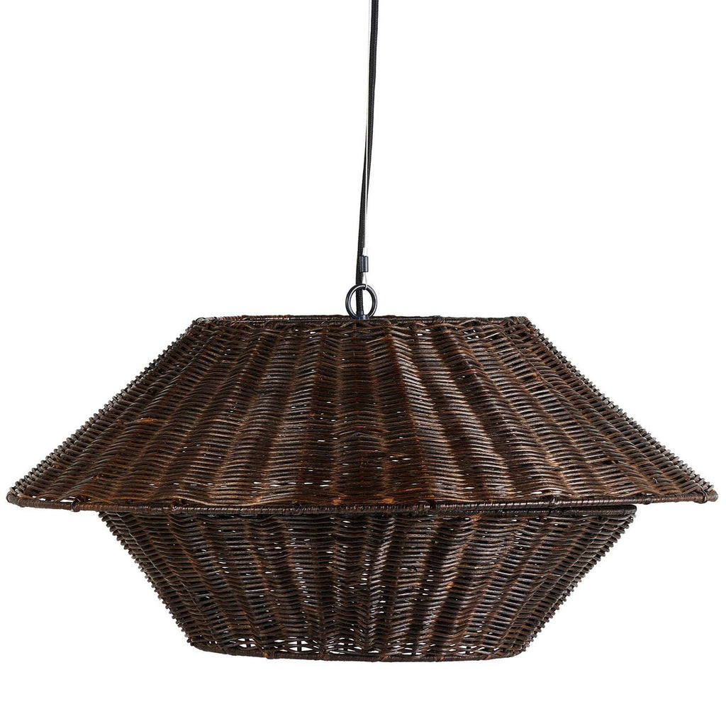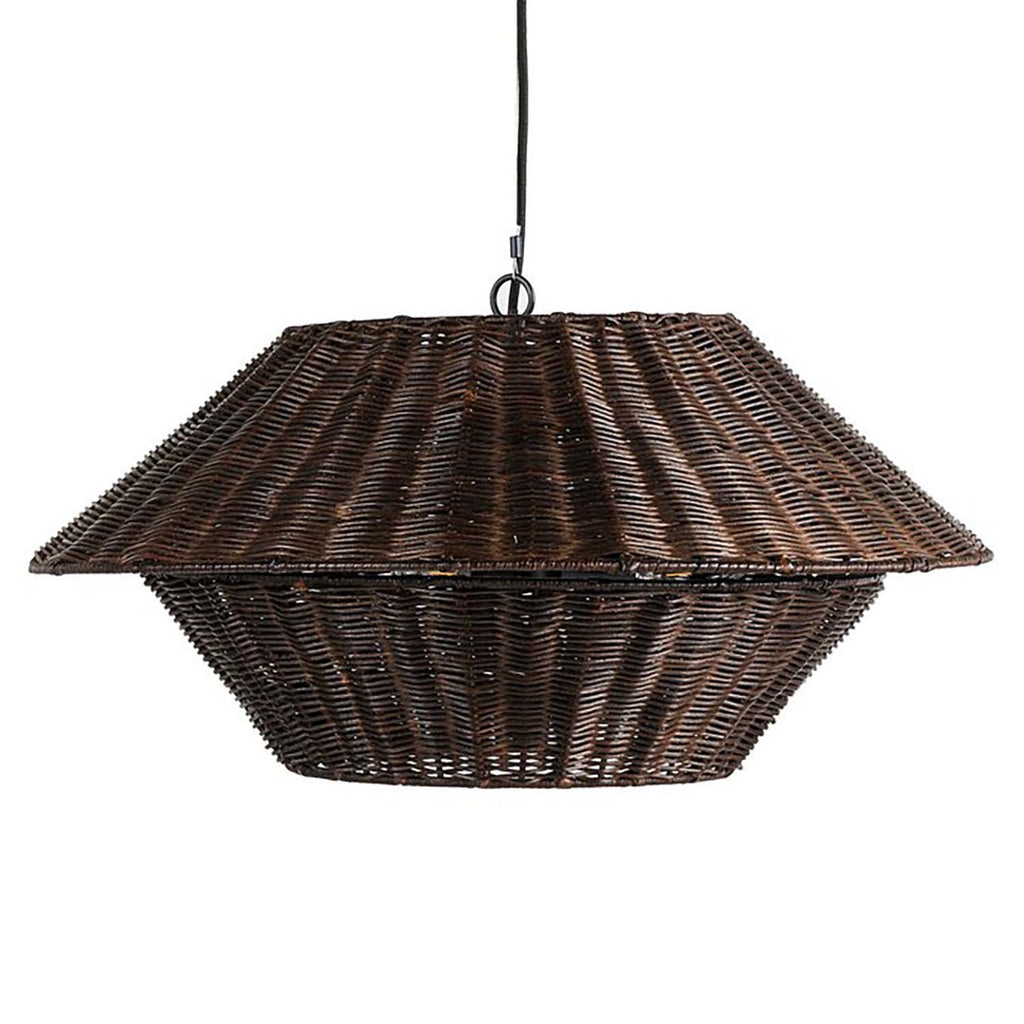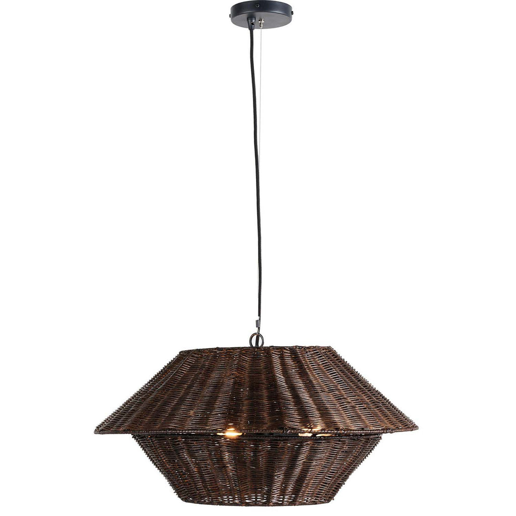 Complemented by the clean lines of a black iron suspension, a geometric brown rattan or linen shade brings a modern touch to this versatile pendant.
