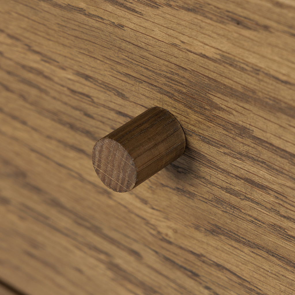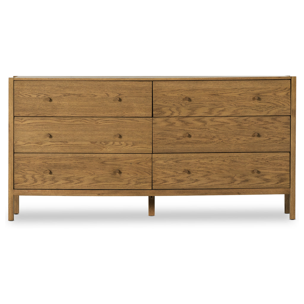 With simple shaping inspired by midcentury casing, exposed framework and a warm oak finish bring a handcrafted, minimalist look to modern bedroom styling, with six spacious drawers for ample storage.