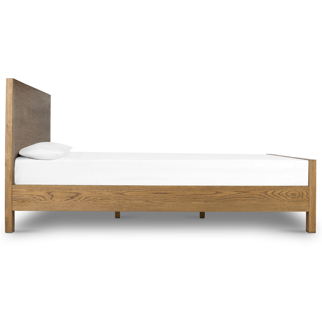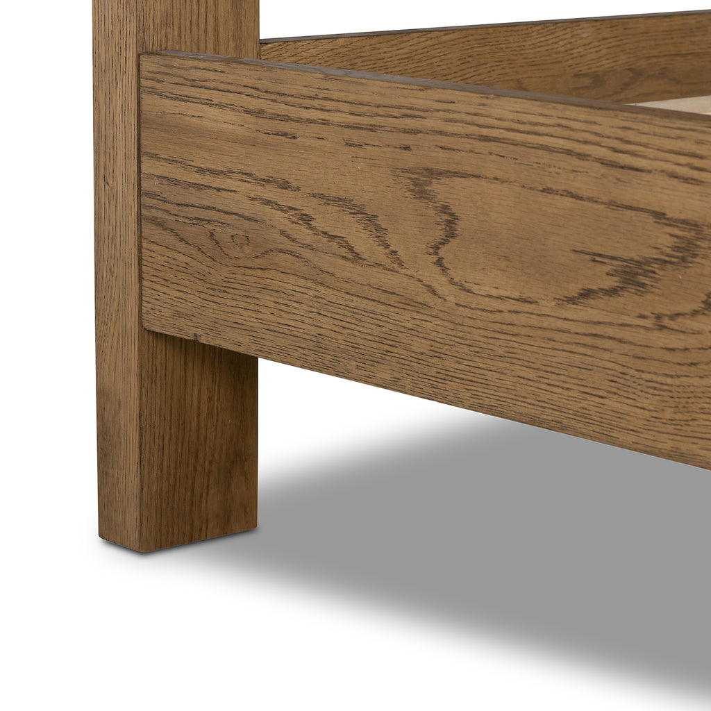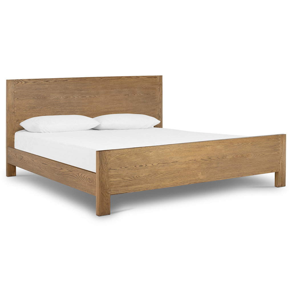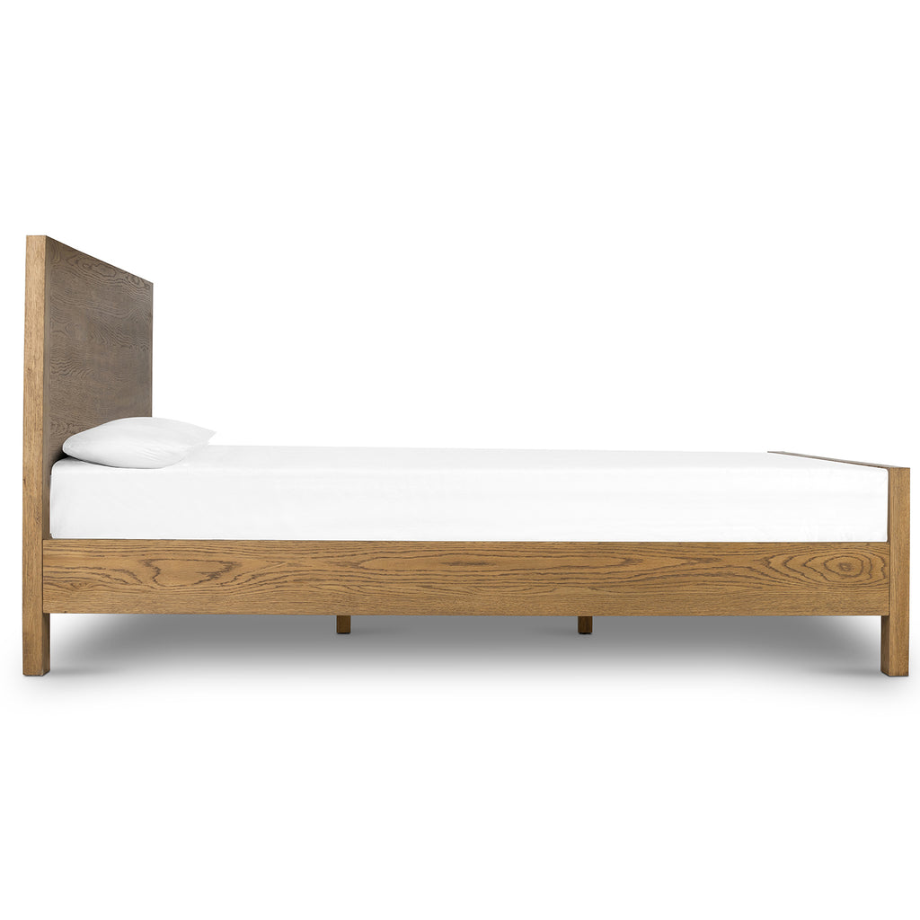 A simply shaped bed of warm-finished oak offers a handcrafted look inspired by midcentury design.
