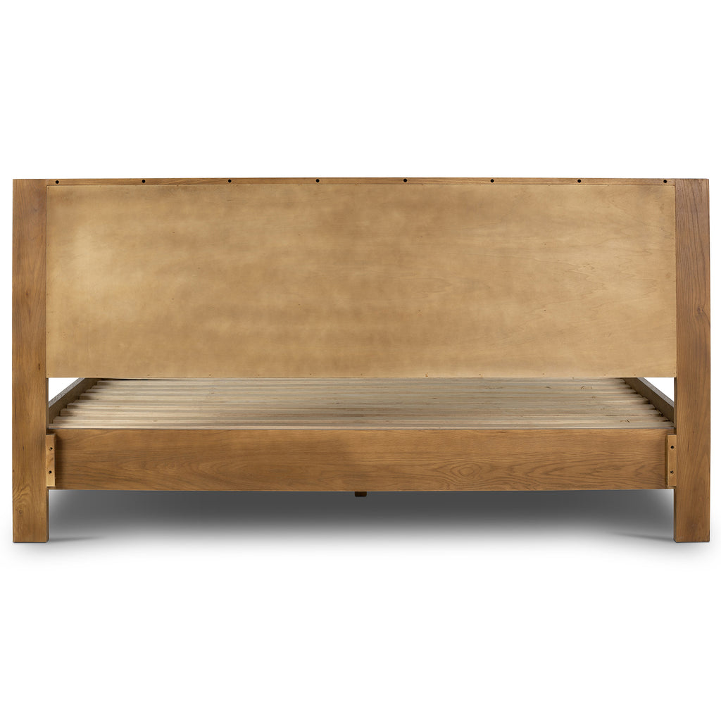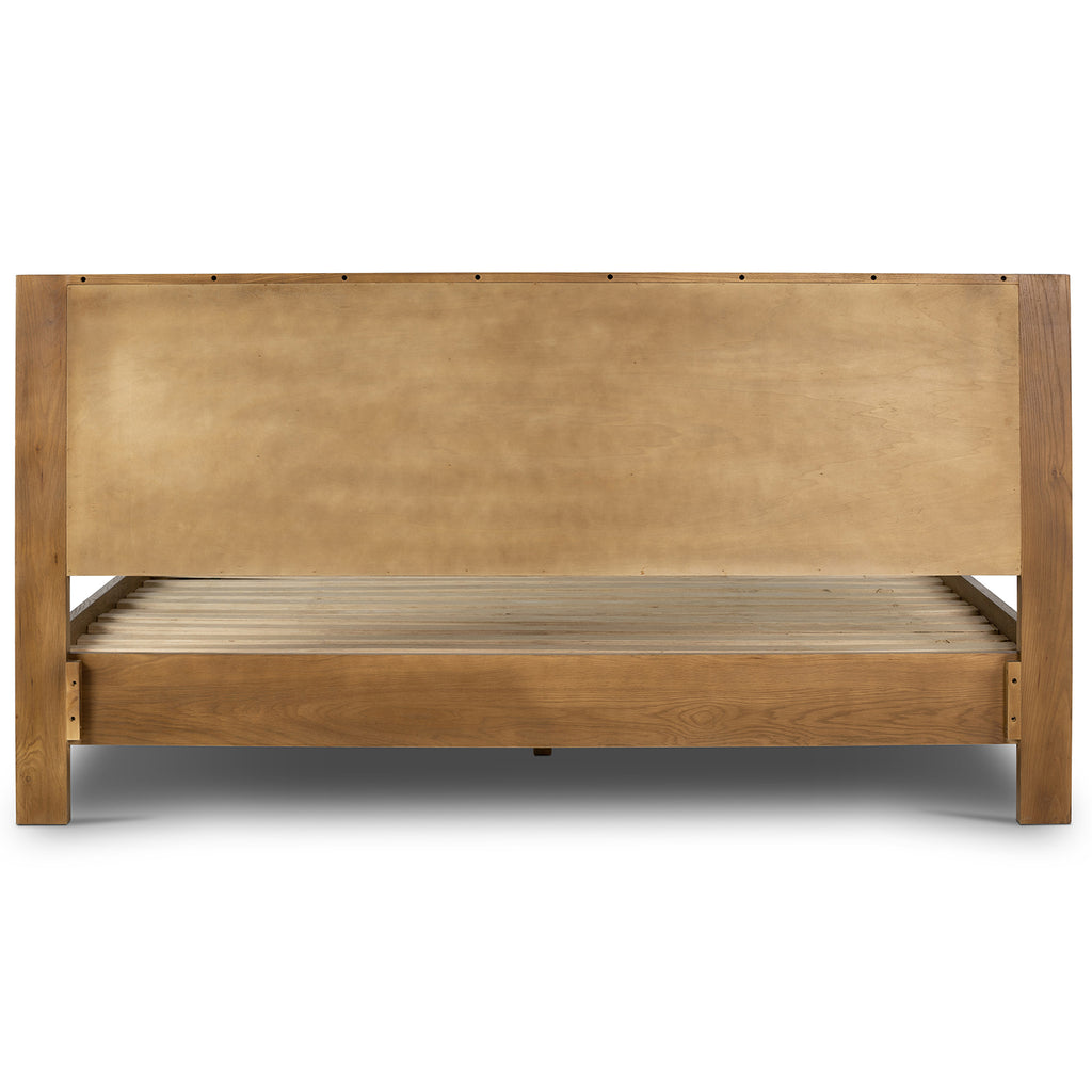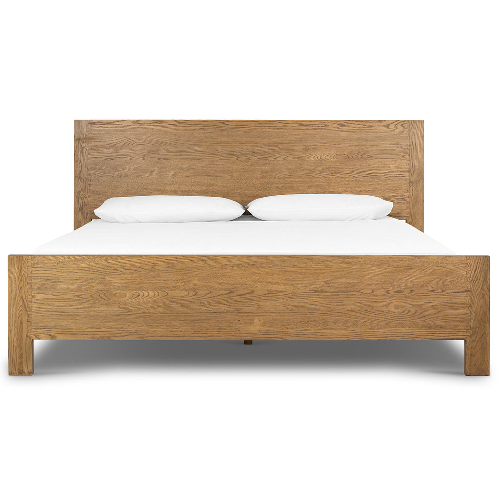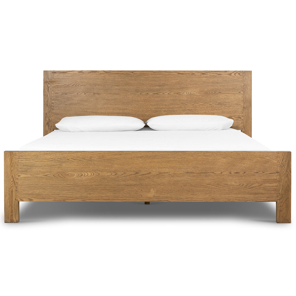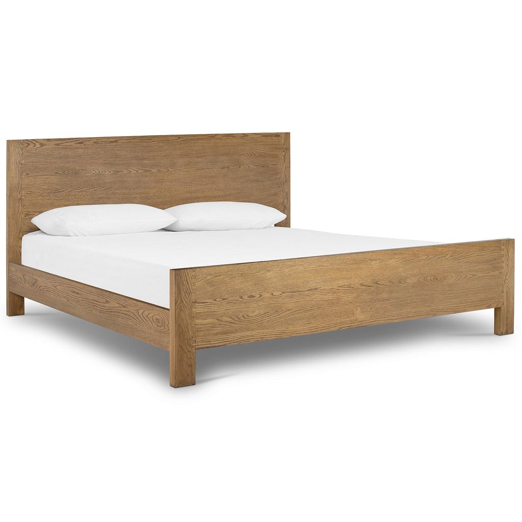 A simply shaped bed of warm-finished oak offers a handcrafted look inspired by midcentury design.