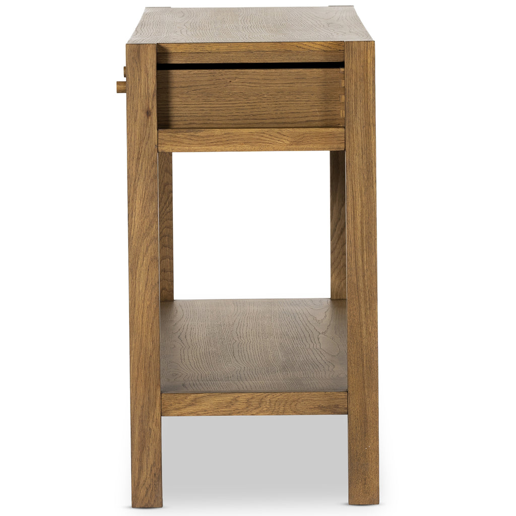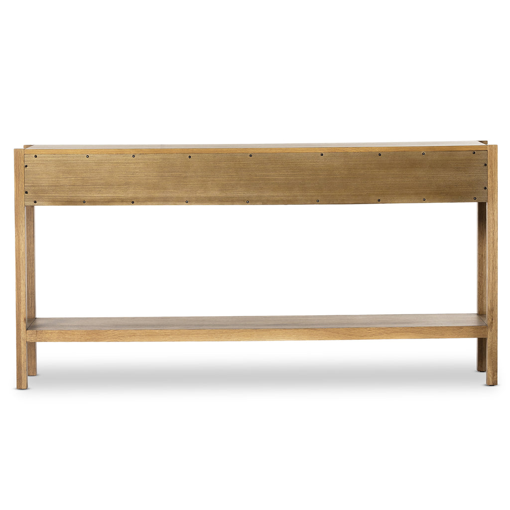 With simple shaping inspired by midcentury casing, exposed framework and a warm oak finish bring a handcrafted, minimalist look to modern media styling. Rear cutouts for cord management.