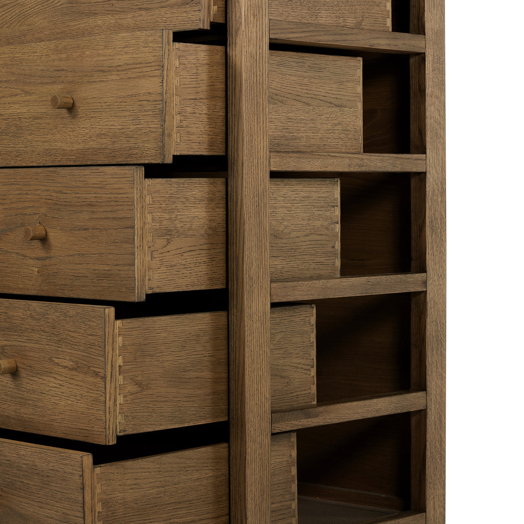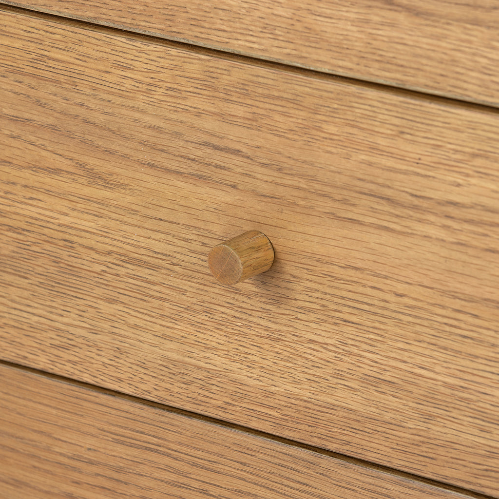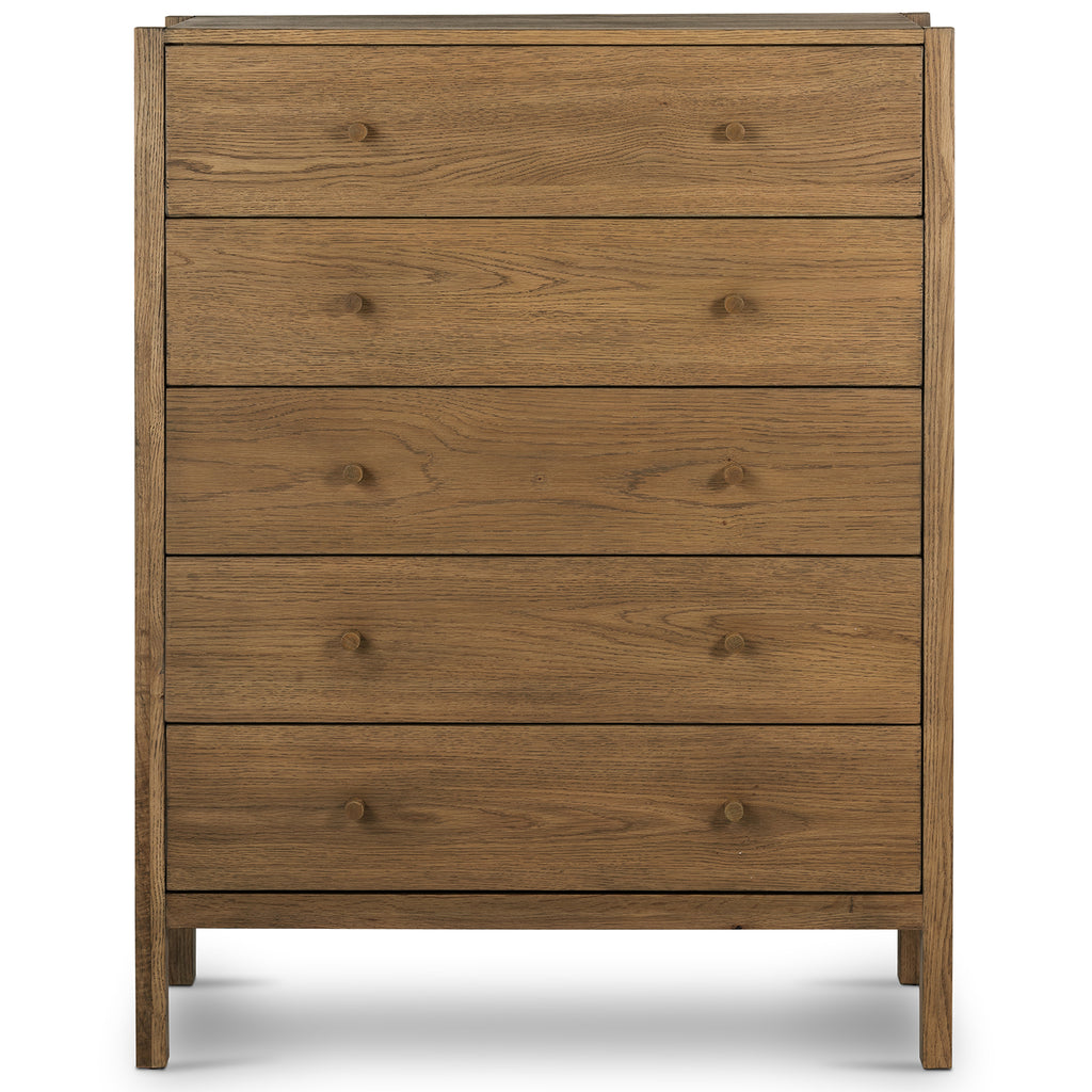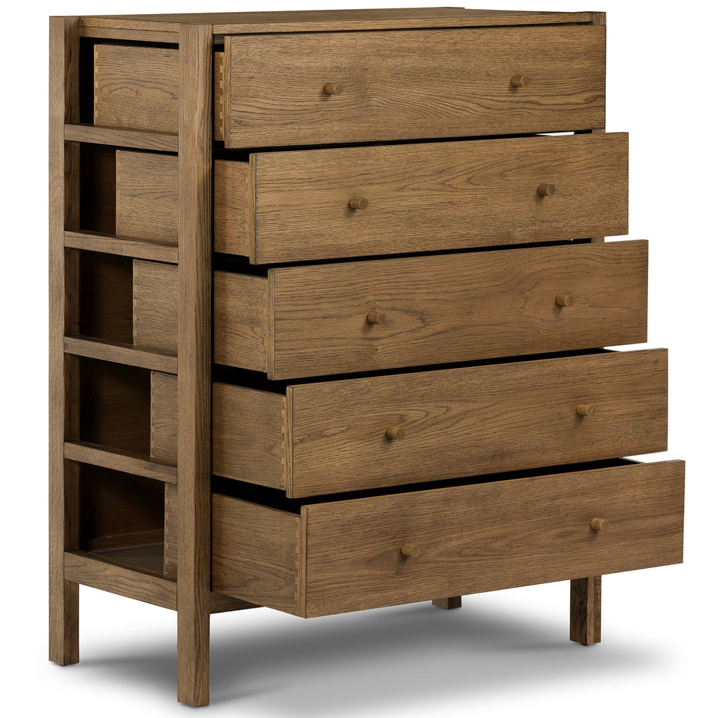 With simple shaping inspired by midcentury casing, exposed framework and a warm oak finish bring a handcrafted, minimalist look to modern bedroom styling, with five spacious drawers for ample storage.