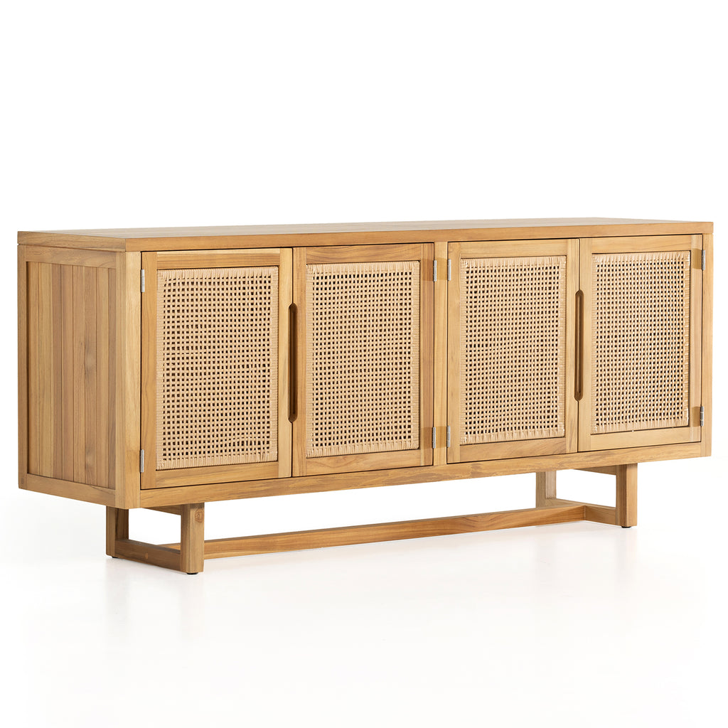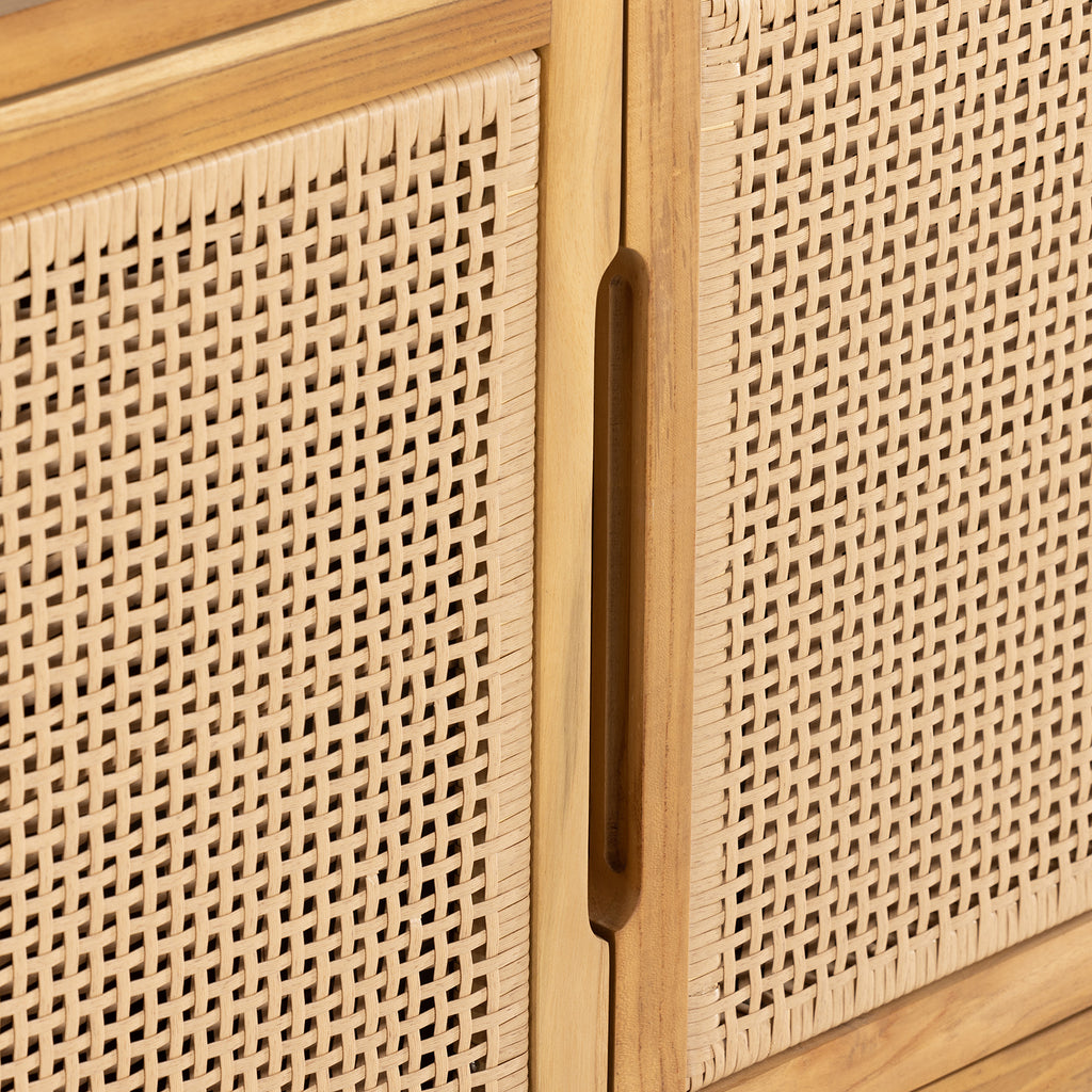 The cane trend moves outdoors. FSC®-certified teak frame is detailed with rattan-inspired woven panels for a breezy, crafted minimalism take on the outdoor cabinet. Includes two removable inner shelves. Cover or store indoors during inclement weather and when not in use.