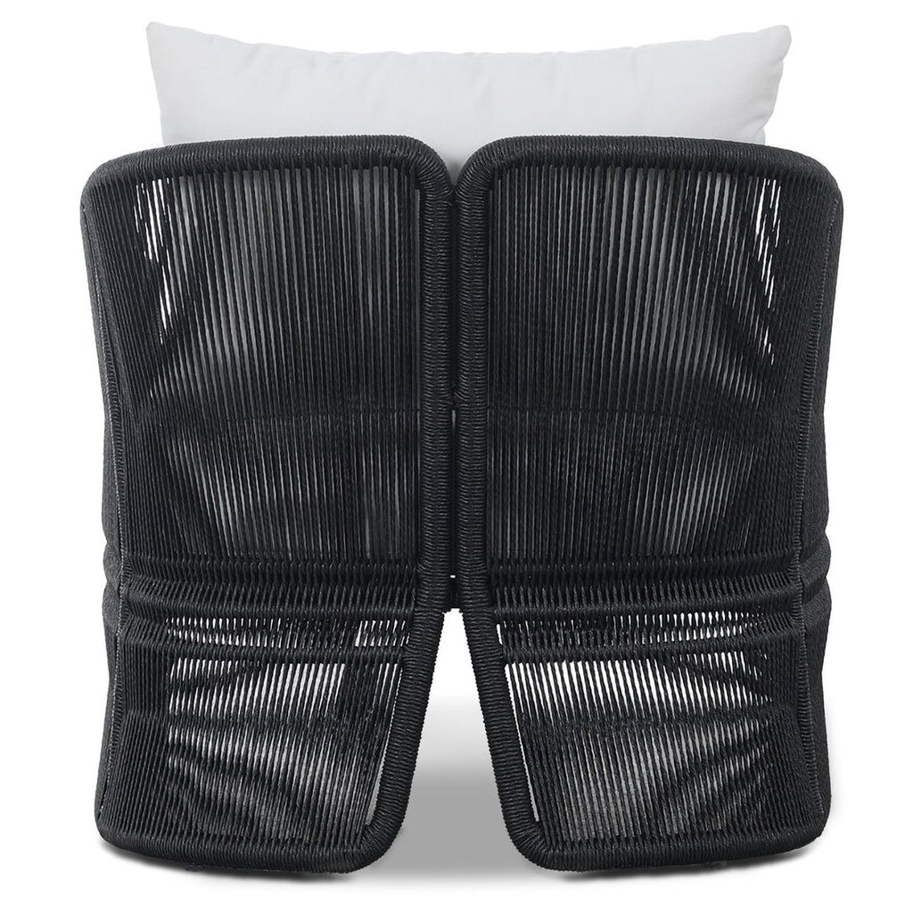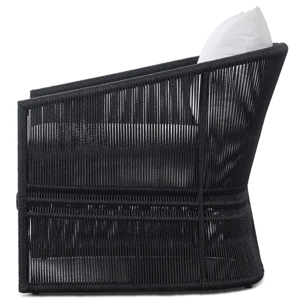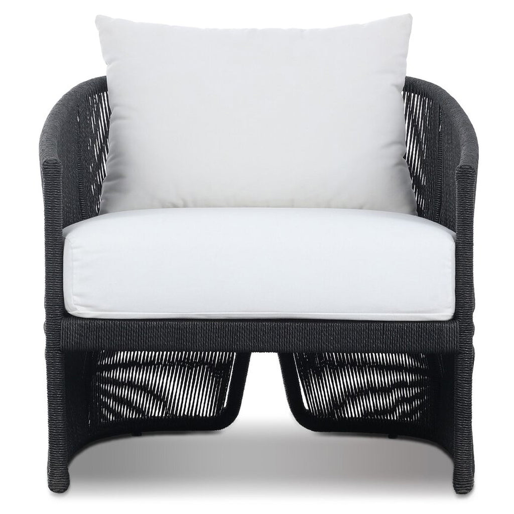 A stunning spot for outdoor lounging. The linear rope-based design on this beautifully woven outdoor dining chair is paired with clean curves. Designed with an angular cutout detail on back so the seat is stunning from all angles. Back and seat cushions are UV-resistant, water-repellent and quick-drying. Cover or store indoors during inclement weather and when not in use.