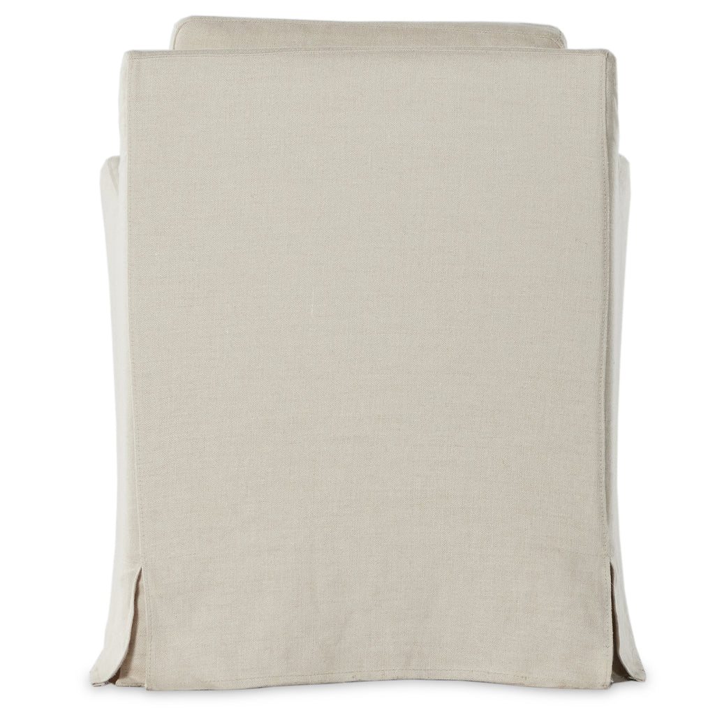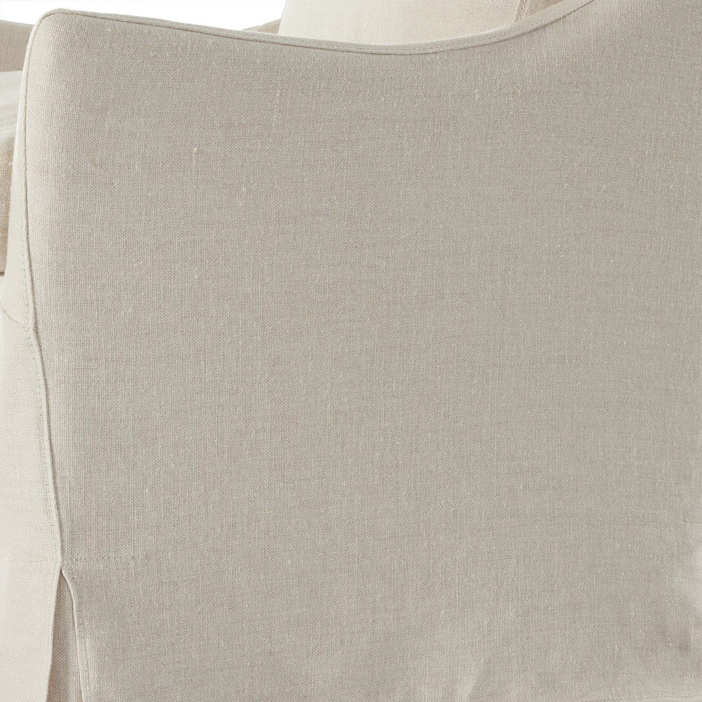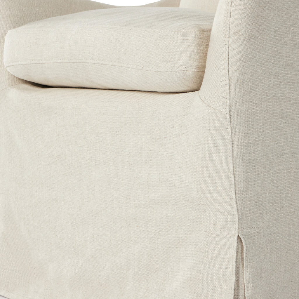 Flared arms and a soft, floor-length slipcover bring a traditional look to everyday dining. Concealed casters for modern ease. Durable and soft to the touch, Libeco™-sourced linens are artisan-made and free of toxic chemicals. Slipcovered styles are fully removable and machine-washable for easy care.