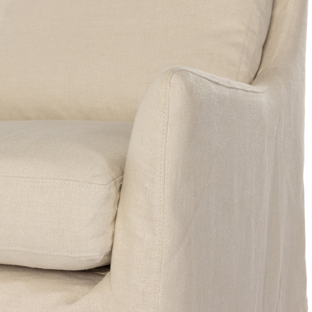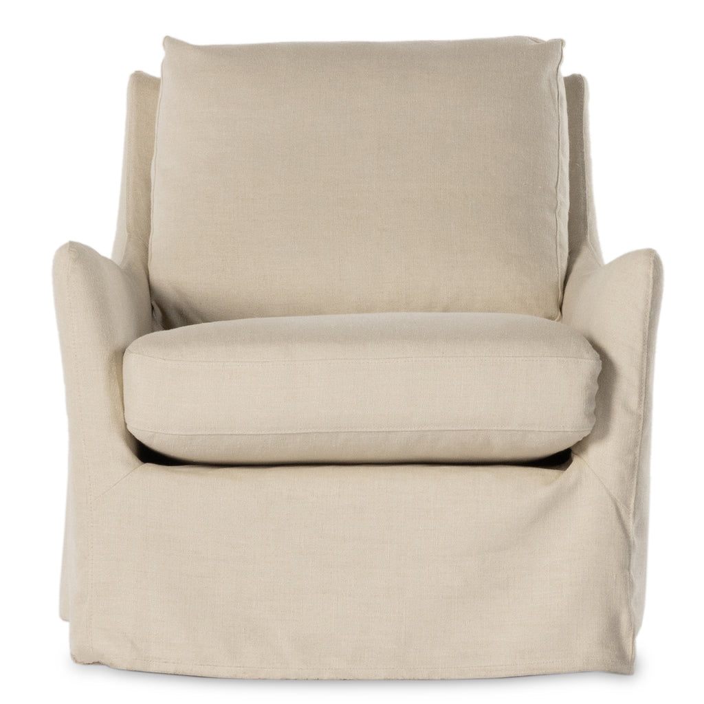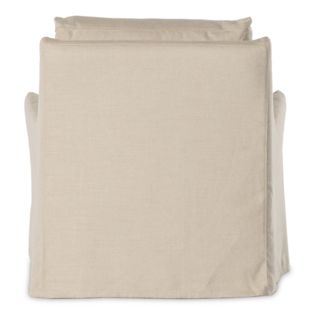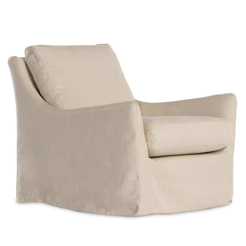 This 360-degree swivel chair is defined by slightly sloping, flared arms and a floor-length slipcover. Finished in a soft, tight weave slipcover for a traditional style. Durable and soft to the touch, Libeco™-sourced linens are artisan-made and free of toxic chemicals. Slipcovered styles are fully removable and machine-washable for easy care.