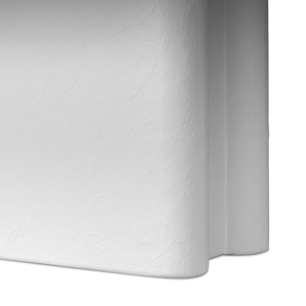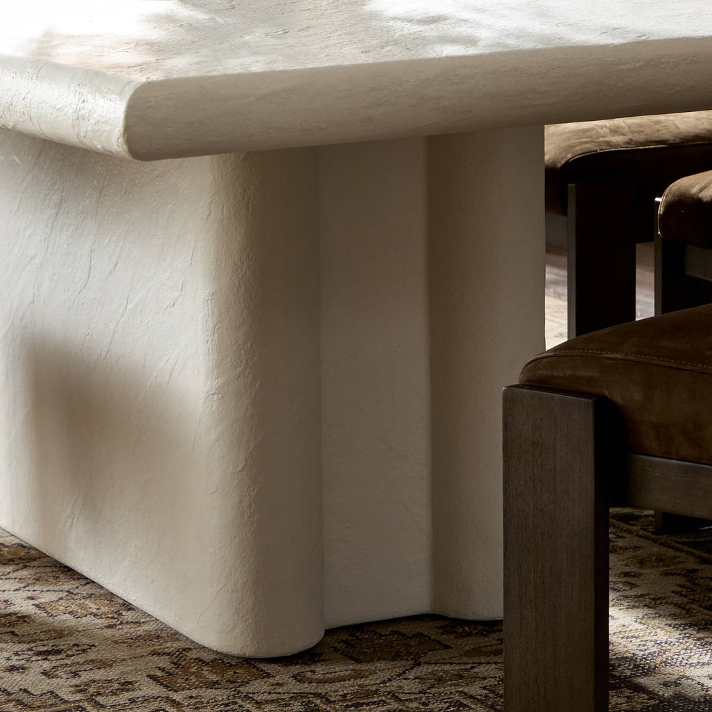 With simple shaping and wide scaling, a rectangular dining table of white-finished concrete offers a crisp look with natural texture. Subtly rounded edges soften otherwise clean lines.The concrete structure that is the focal point of this piece may have unique natural characteristics such as small open pores and slight cosmetic splits to the surface.