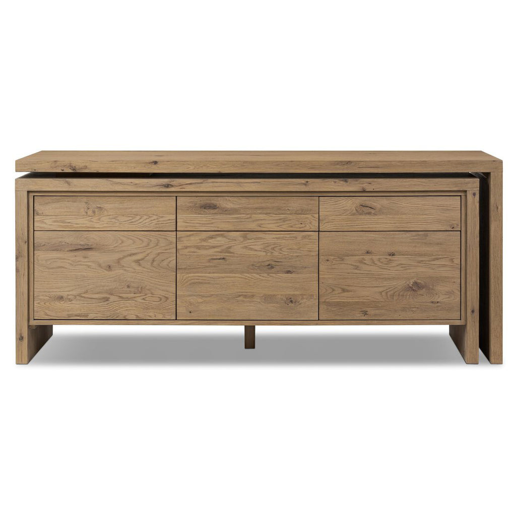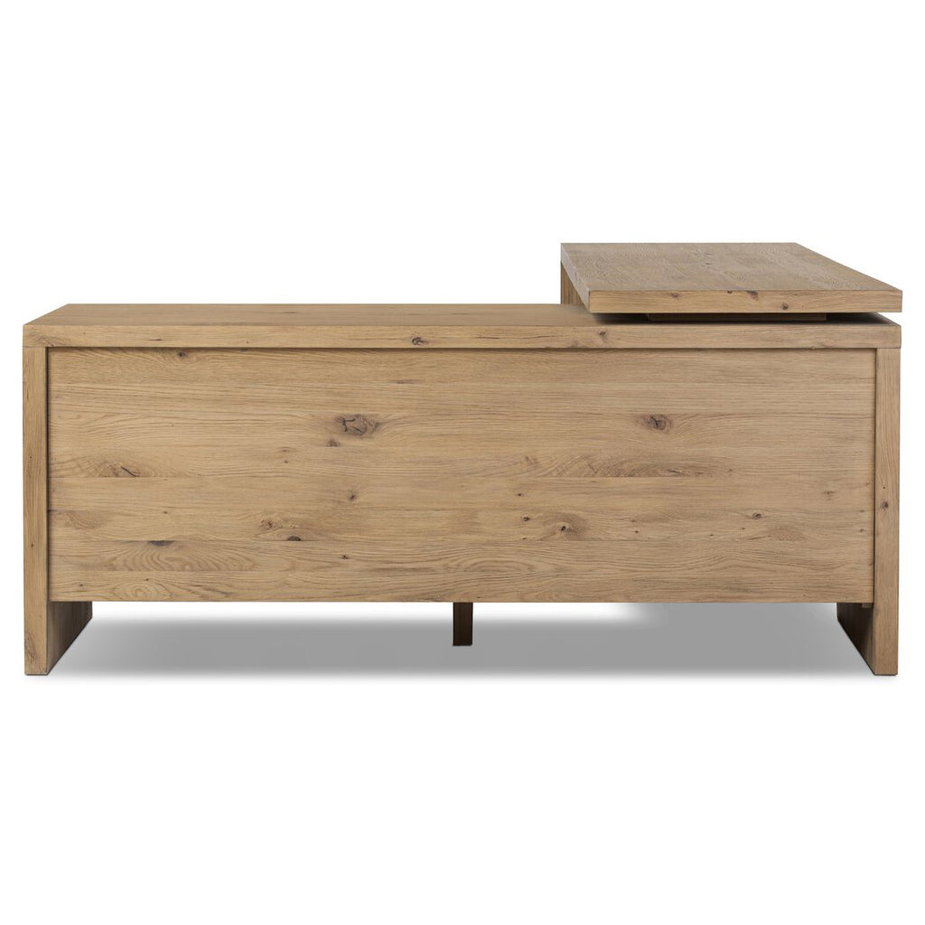 Customization and functionality fuse in a rotating desk of aged smoked oak. With plenty of storage space by way of drawers and cabinetry, a unique L shape and 360-degree mobility offer several orientation options, to comfortably suit a wide range of spaces.