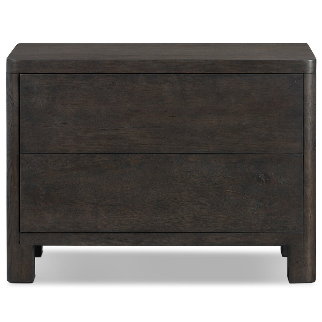 Topped with a thick plank of solid oak, this extra-wide nightstand blends modern lines and warm character with two roomy drawers, slightly curved corners, and solid square legs. Seamless drawer fronts have a push-latch mechanism. Made from solid oak and veneer in a smoky black finish.