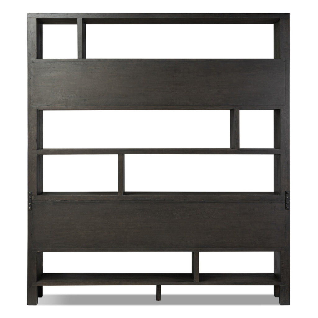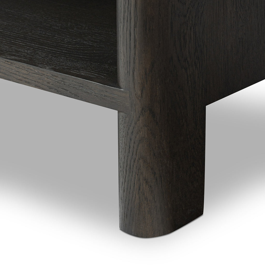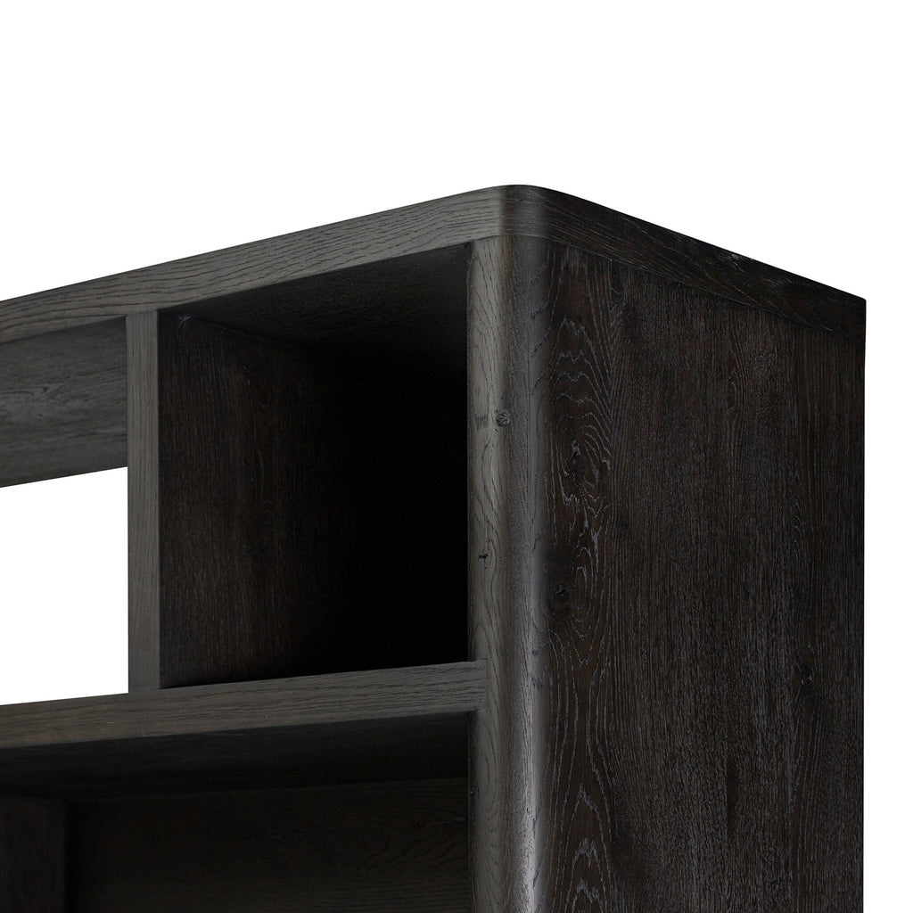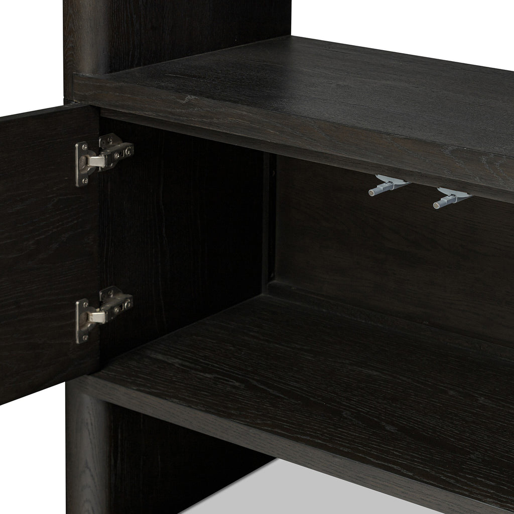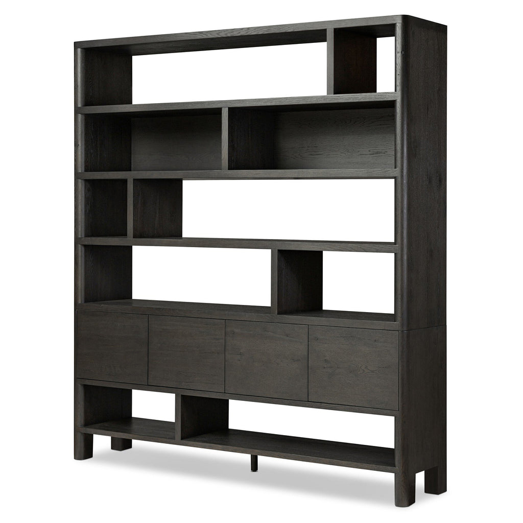 Made from solid oak and oak veneer, a wide bookcase offers open and concealed shelving, for both storage and display. Push-latch doors make for a clean, seamless look, while subtly rounded corners soften up the whole look.