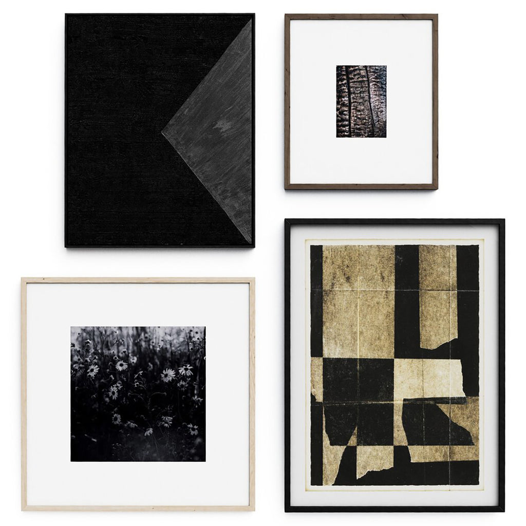 A study in contrast. This four-piece set includes Floral Film II by Annie Spratt, Triangle Right by The Holly Collective, Dark 2 by Dan Hobday and Char IV by Four Hands Art Studio. Handmade in Austin, Texas.